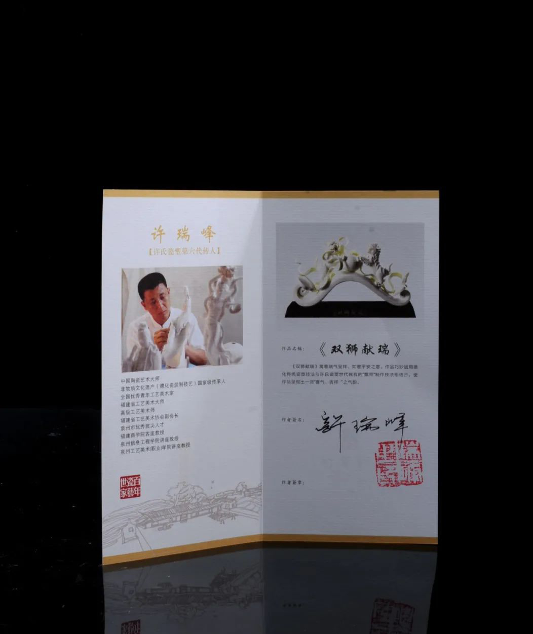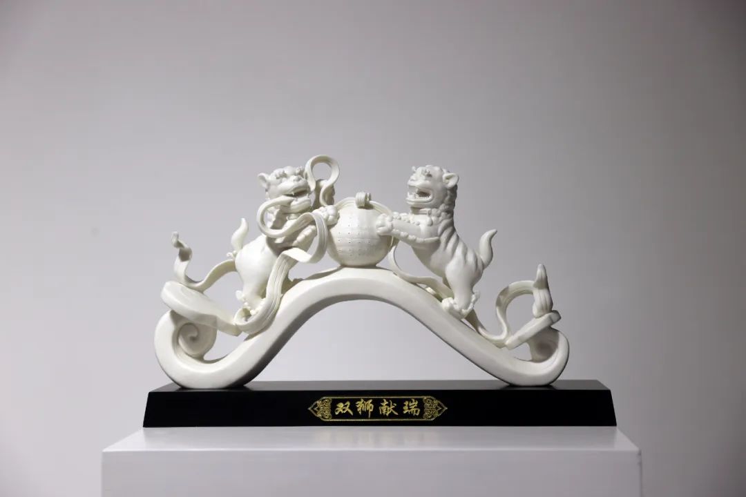 许瑞峰介绍,1997年至2005年期间,为更好地推广德化陶瓷,德化县委县政府每年都会组织本地一些陶瓷企业、艺术家,到北京、上海、杭州、南京、深圳、西安、成都等大中城市举办一场对外宣传的展会。2000年举办展会前主办方找到他,希望他能创作一件寓意吉祥且又能体现德化传统陶瓷技艺的展会伴手礼。于是,他取材“狮文化”中的双狮戏球,历时近半年时间,中间几易其稿,创作了这件《双狮献瑞》作品。