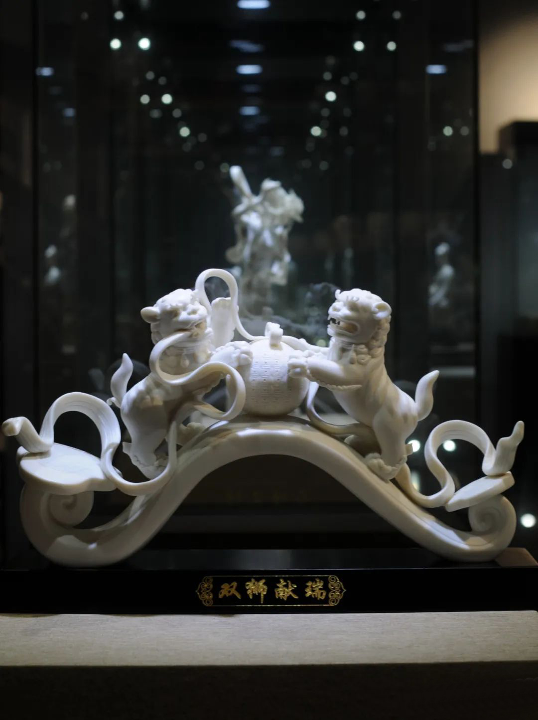 在许瑞峰看来,中国的吉祥文化门类有很多,其中“狮文化”因被赋予镇宅、辟邪、喜气、吉祥等多重寓意,历来深受德化瓷艺家喜爱,也诞生过许多优秀的作品。在展厅二楼,记者见到了他“狮文化”代表作之一《双狮献瑞》——一件雕工精细的玉如意上,两只形态各异的狮子围着一颗绣球,左侧的狮子口衔飘带往右转头,似乎在与参观者互动,右侧狮子则目视前方,专注地看着对方。整件作品巧妙结合德化传统瓷塑技法与许氏瓷塑飘带制作技法,呈现出喜气、吉祥的气韵。