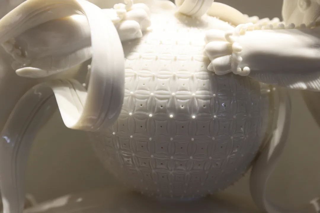 由于白瓷在高温烧制过程中有一定的收缩率,狮子、悬空的飘带、如意以及绣球很容易开裂、拉断或塌陷,因此烧制以来成品率一直不高。他不断总结改进,如今小件作品的成品率提高到40%,而大件作品的成品率只有10%。在他的工作室,就摆放着一件整个如意烧制开裂的残品。