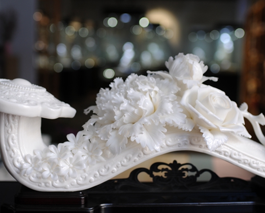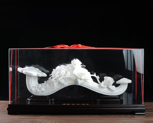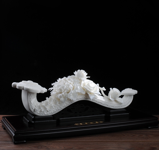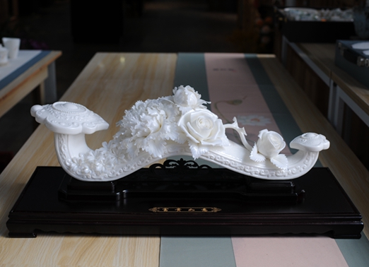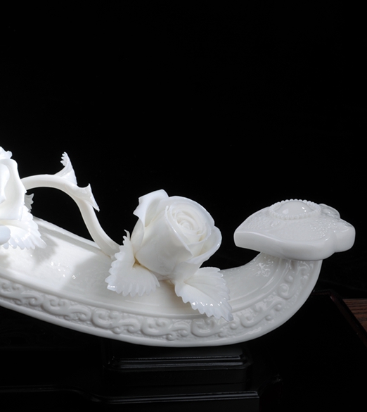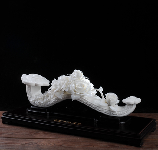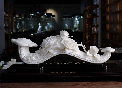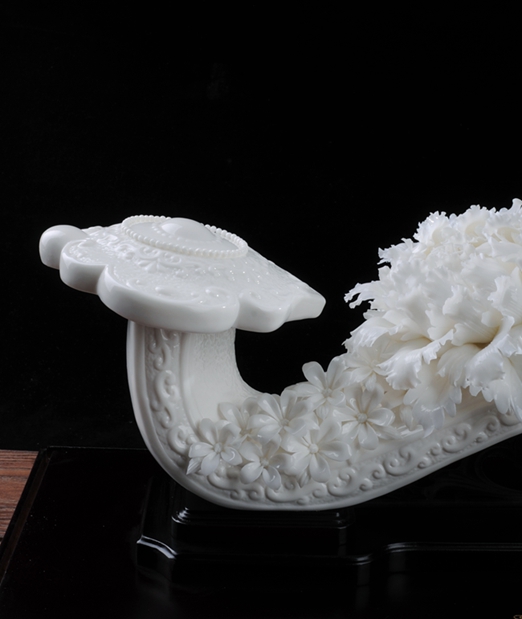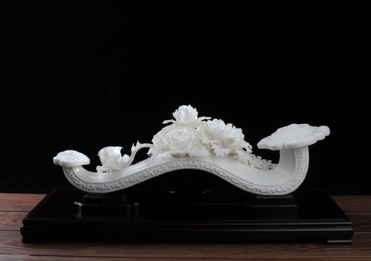 《富贵如意》以德化具有温润如玉的”中国白" 为胎质塑造,德化瓷与传统如意文化相结合雕刻而成。 作品如意之上可见有牡丹、玫瑰花、小花雕刻点缀等,白色的玫瑰花干净无暇,牡丹代表富贵,树叶枝干线条流畅、简洁,整件作品构思巧妙,布局合理,把富贵如意这一美好寓意表现得淋漓尽致。