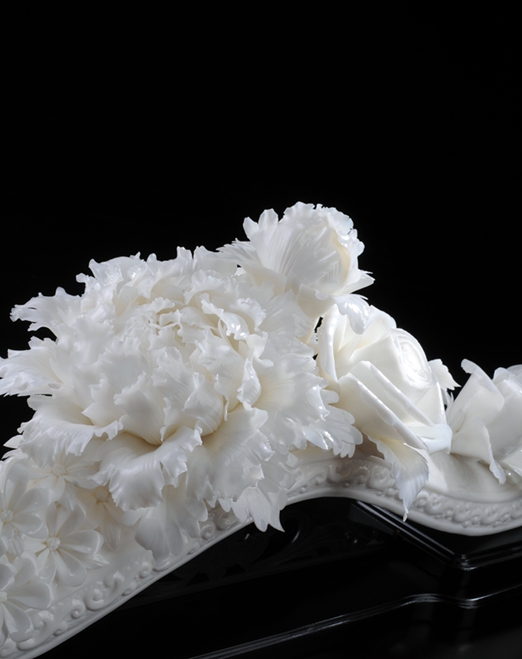 瓷花纯手工捏制,细腻精致、薄如蝉翼、以假乱真,每片花瓣层层叠叠,繁复但线条流畅。手工精雕细琢,刀工精湛,线条清晰、简洁、潇酒、多变化,柔媚流畅,翻转自然,展现瓷雕艺术的魅力。