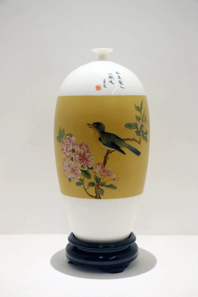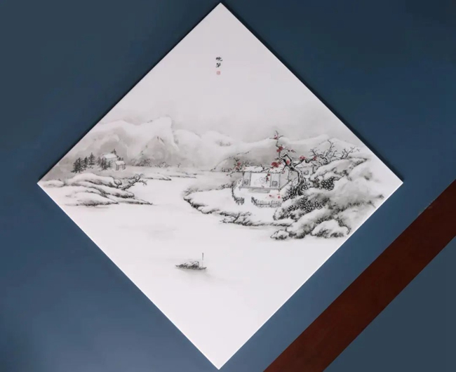 祖父林质彬的瓷画造诣无疑影响了林晓芳的创作心境与胸怀。作为新一代的瓷画传人,林晓芳对自己的创作之路有着更清醒的认识,给出了自己的方向和定位。林晓芳的瓷画作品绘画种类丰富多样,有釉上新彩、古彩,釉下五彩、青花、高温颜色釉等。她惯以写意或兼工带写的技法绘画作品,作品风格简练洒脱、意境深远,画面布局舒适得当,并且注重留白式绘画技法。