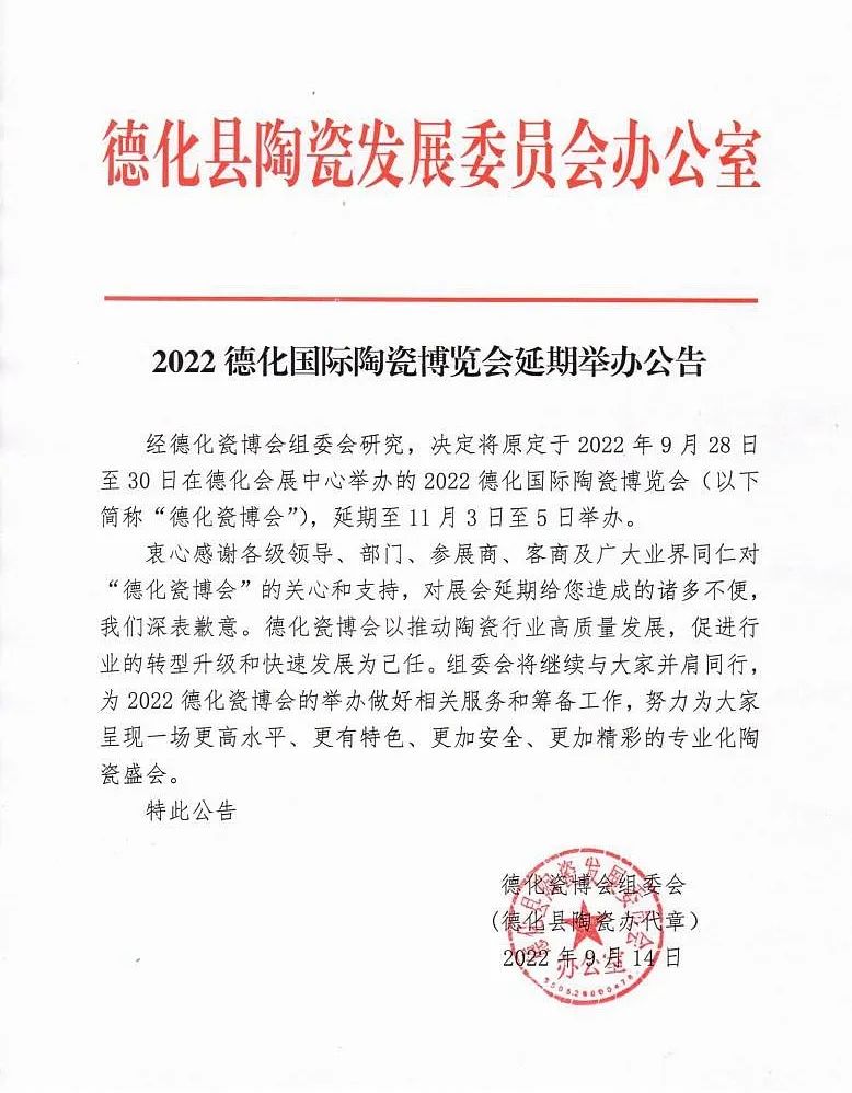 衷心感谢各级领导、部门、参展商、客商及广大业界同仁对“德化瓷博会”的关心和支持,对展会延期给您造成的诸多不便,我们深表歉意。德化瓷博会以推动陶瓷行业高质量发展,促进行业的转型升级和快速发展为己任。组委会将继续与大家并肩同行,为2022德化瓷博会的举办做好相关服务和筹备工作,努力为大家呈现一场更高水平、更有特色、更加安全、更加精彩的专业化陶瓷盛会。特此公告。