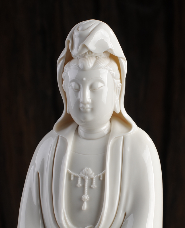 早在明代德化白瓷佛像就名声在外,一代“瓷圣”何朝宗佛像名作流传后世,成为世界各大博物馆收藏的珍品,更对佛像雕塑史上产生深远的影响,形成“何派”雕塑,其开创的捏、塑、雕、刻、刮、削、接、贴八字技法延用至今。何派观音雕塑注重于细节之美,精益求精,故而十分着意衣纹的刻画,使线条流畅,翻转自然。观其佛像,仿佛有春风拂面,衣袂飘扬的出尘之感。