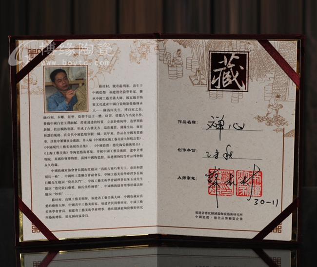德化瓷塑观音被称为“东方的维纳斯”,《禅心》由福建省工艺美术大师苏杜村设计创作。本尊观音面部表情十分静谧安逸、端庄慈祥,脸形宽、额丰颐、外眼角稍微挑起,双目低垂、敛神凝思、额头与鼻梁齐平、鼻尖圆润欲滴、状若悬胆,鼻翼两边用平整的直线与眉弓相接,嘴角深晰,笑意若隐若现。衣纹处理深得其尊师中国工艺美术大师——苏清河教导,人物的手足、珠串、花饰等经由手工捏塑而成,其精巧纤秀,工细逼真,造型生动,形象传神,精雕巧塑,风格独特。瓷胎质洁白,纯净温润,犹如脂玉。作品限量发行30尊,本尊为第11号,作品背后落有苏杜村签名及印章落款及作品编号,兼具审美价值和收藏价值,是不可多得的雅作。是办公、家居、书房装饰摆设、礼赠、收藏的好选择。