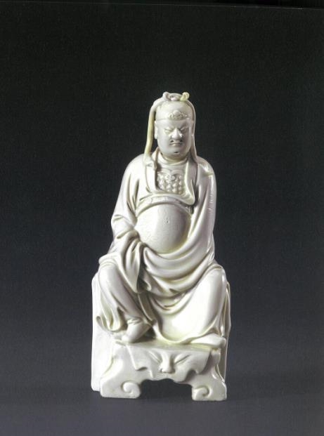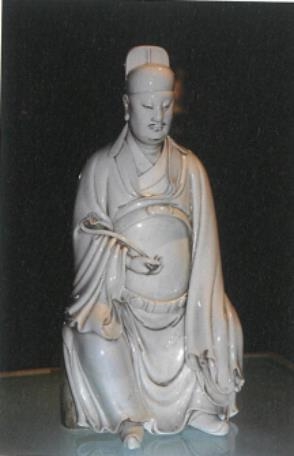 何朝宗留存于后世的作品寥若星辰,德化县陶瓷博物馆收藏的何朝宗瓷塑作品《文昌帝君》与《祥云观音》即为其二。在“明代白瓷·独树一帜”展厅,镇馆之宝祥云观音像,通体泛牙白色,线条清秀婉转,自如流畅;观音头披巾幔,脚踏祥云,面露慈悲,略略俯首,状若普度世间众生,令观者心生敬爱。仅一尊观音像,尽显何朝宗的瓷塑功力。