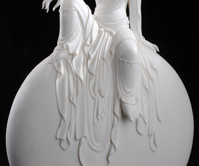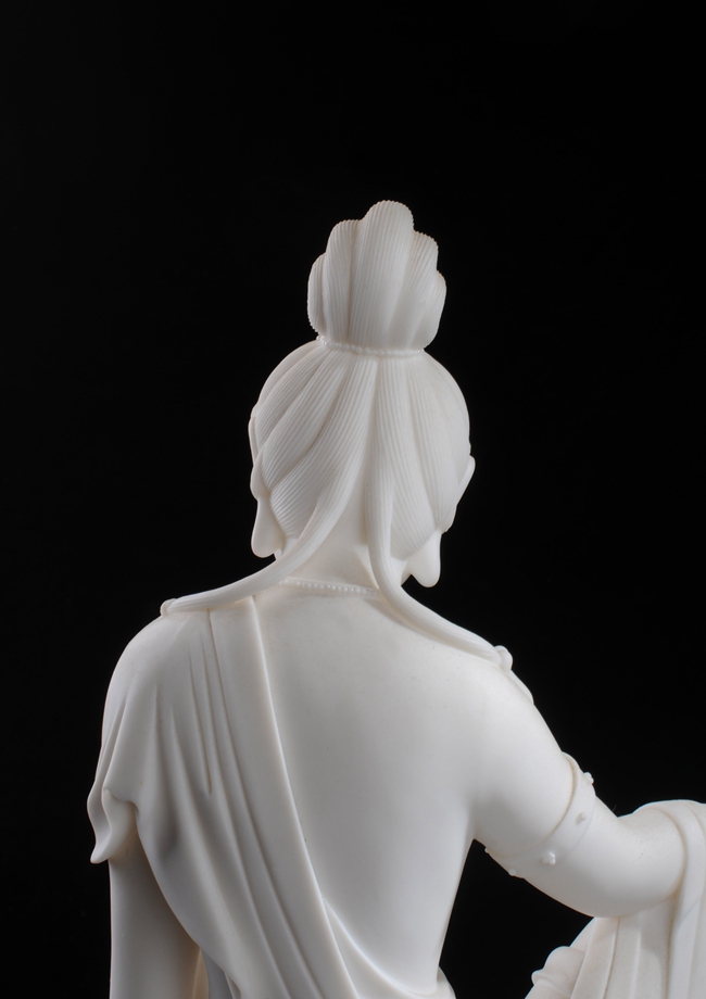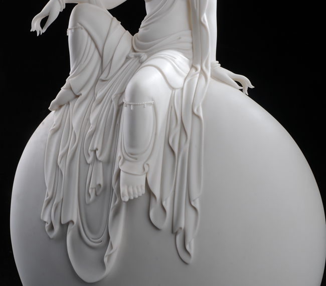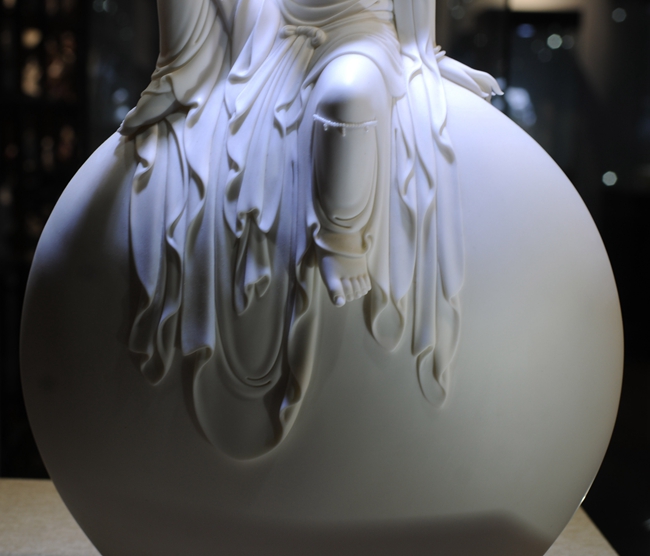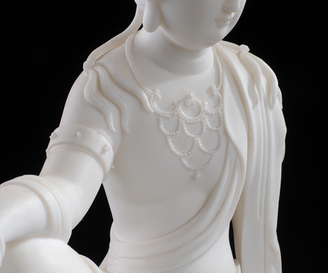早在明代德化白瓷佛像就名声在外,一代“瓷圣”何朝宗佛像名作流传后世,成为世界各大博物馆收藏的珍品,更对佛像雕塑史上产生深远的影响,形成“何派”雕塑,其开创的捏、塑、雕、刻、刮、削、接、贴八字技法延用至今。何派观音雕塑注重于细节之美,精益求精,故而十分着意衣纹的刻画,使线条流畅,翻转自然。观其佛像,仿佛有春风拂面,衣袂飘扬的出尘之感。