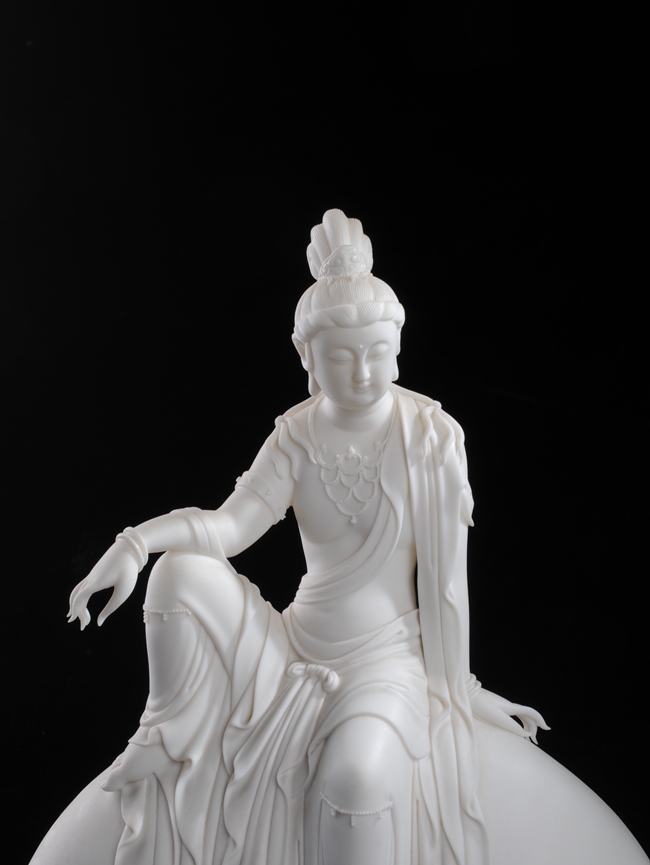 观音右膝曲起,右臂置于右膝之上,手指微翘;左腿自然垂下,左手为支撑点,自在闲适之感跃然眼前。又因其材质洁白如玉,颇有纯净神圣之感。