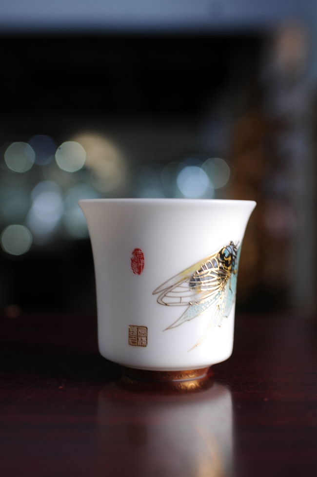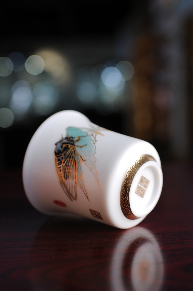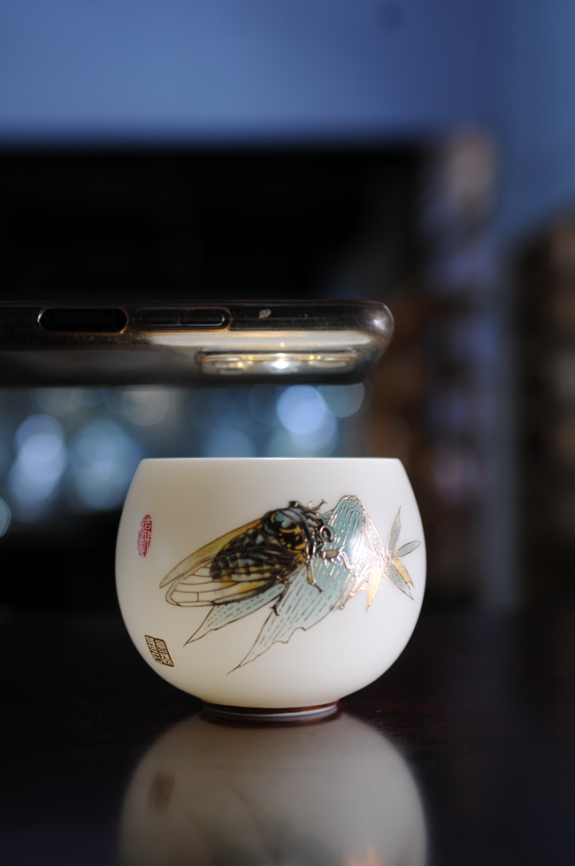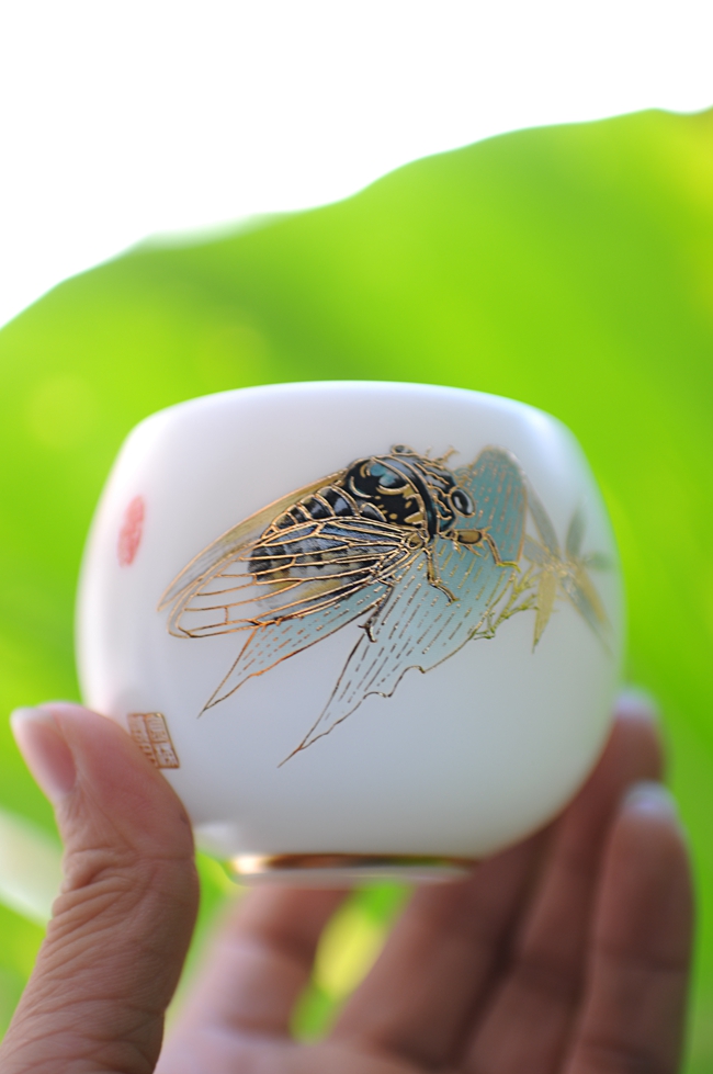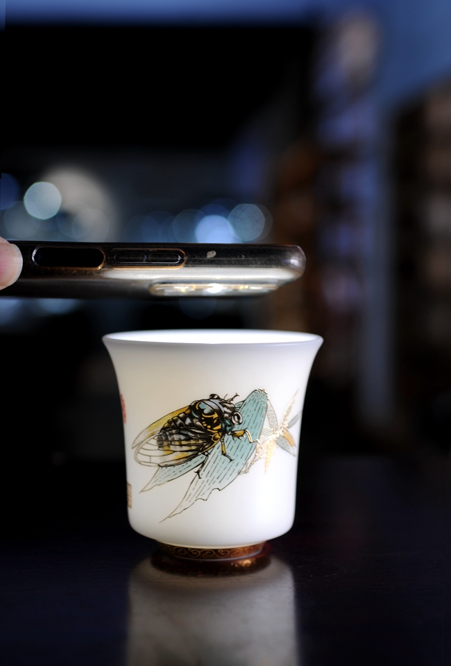 手机灯光照耀下,通透明亮,质感细腻温润,给人以温柔甜净之感,蝉鸣图,描金装饰点缀,圈足工整,大师亲笔印章,颇具艺术欣赏价值,值得细细品玩!