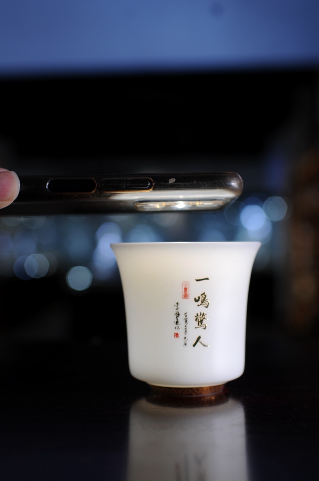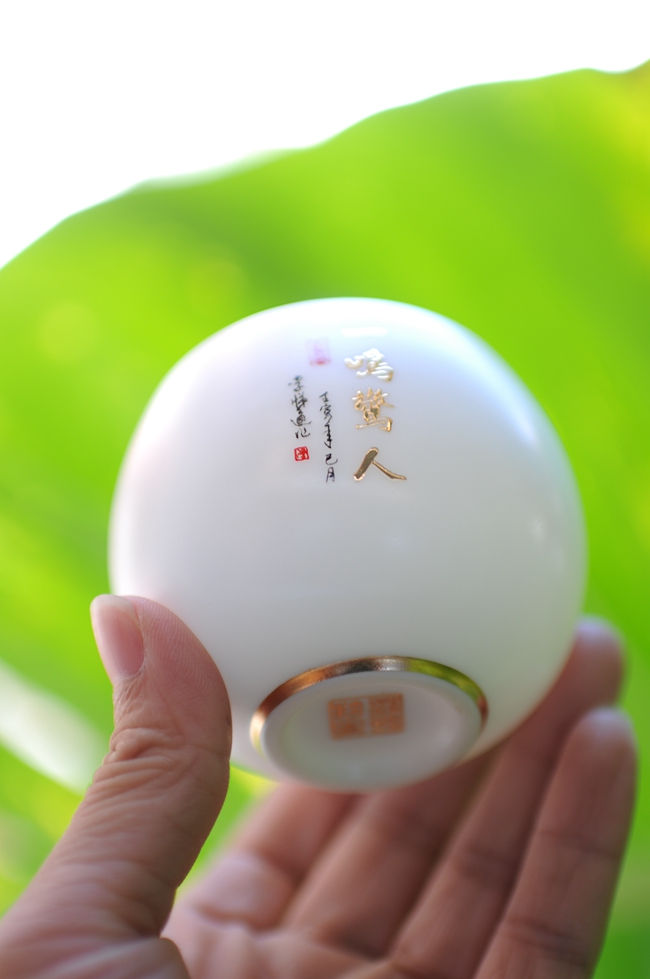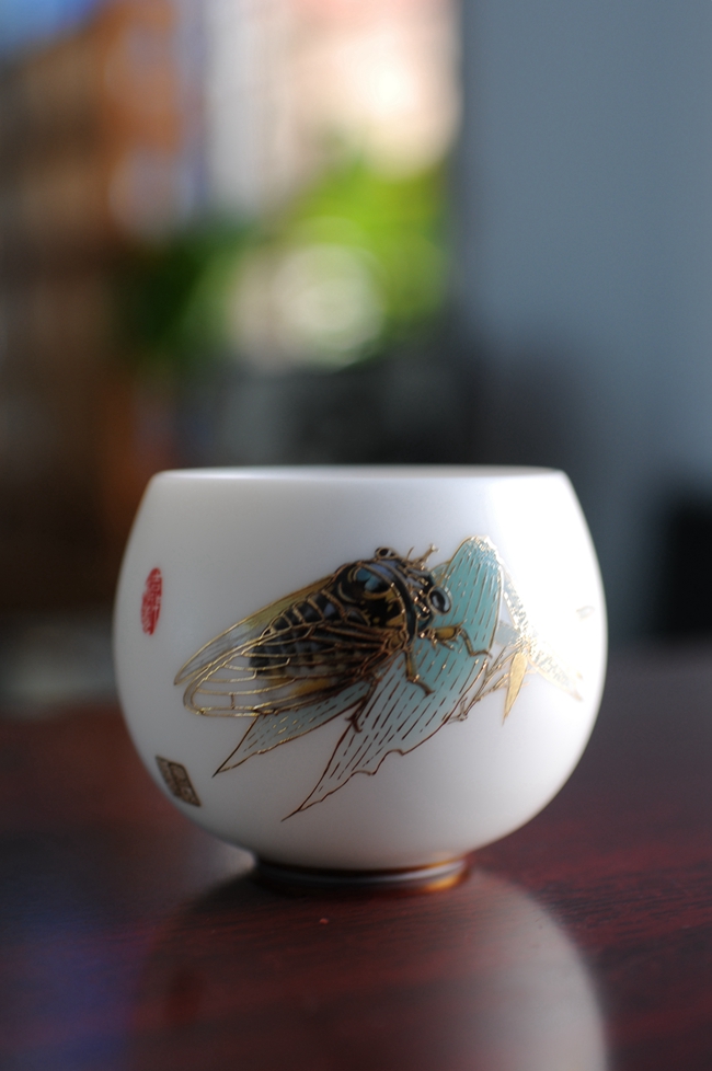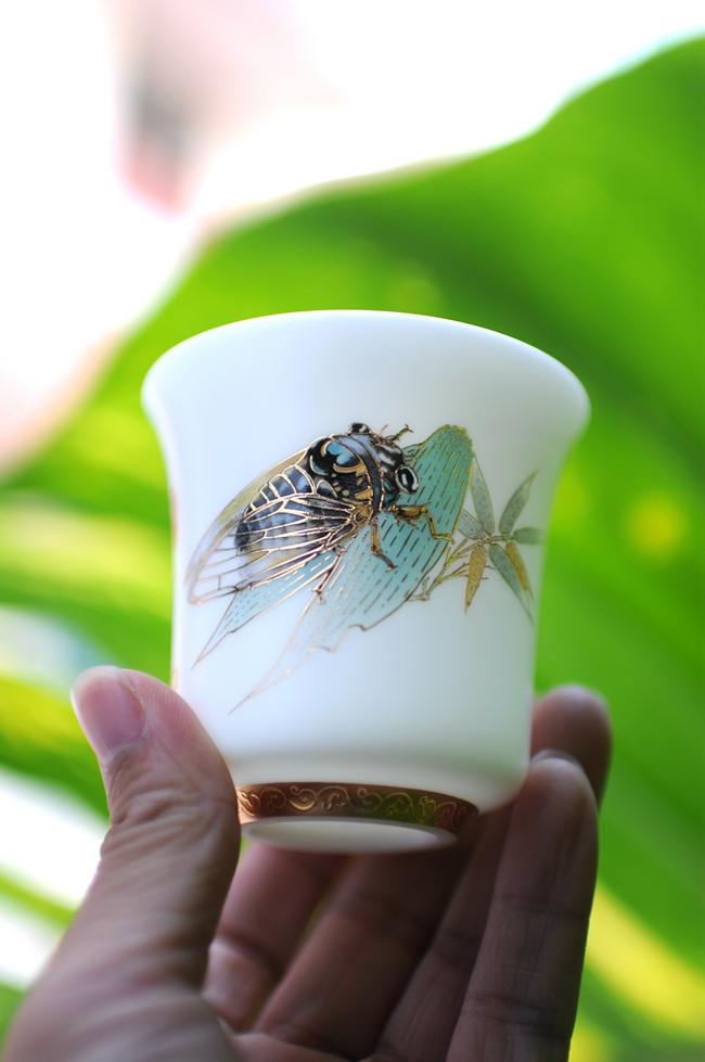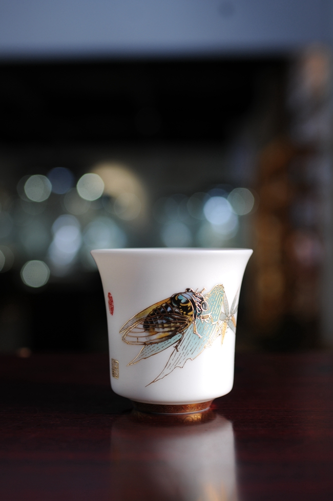 手机灯光照耀下,通透明亮,质感细腻温润,给人以温柔甜净之感,蝉鸣图,描金装饰点缀,圈足工整,大师亲笔印章,颇具艺术欣赏价值,值得细细品玩!