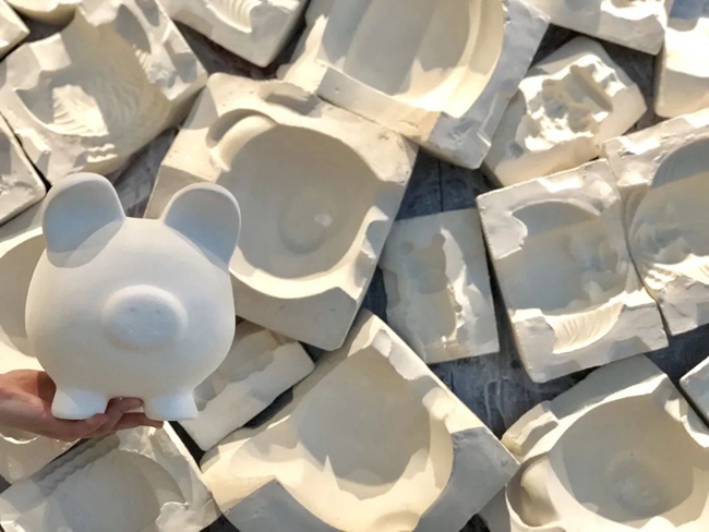 “一个石膏模具大概可以做出40只猪宝贝哟!”老师说道,“石膏模具是陶瓷生产中用来批量成型产品的工具。采用石膏作为模具的材料是因为石膏具有很强的吸水性,能够使得模具内壁的泥浆快速凝固而成型。当石膏模具经过多次注浆使用达到一定湿度后,便需要进行模具烘干,以便模具再次循环利用。”