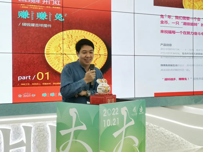 瑞泥工坊创始人林清增带来了兔年新品《赚赚兔》,以一个会“转”的金币,一只“潮级能转”的赚赚兔,祝福每一个在努力奋斗的人们。赚赚兔祝福生肖的设计,将中国年吉祥元素与人们对财源滚滚的美好期待结合一起。让“越转越多的赚赚兔”成为兔年最潮的祝福。