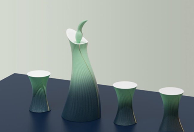 设计说明:只此青绿分酒器造型灵感来源舞蹈诗剧《只此青绿》,整体造型宛若舞者衣袂翩翩,以当代的表达方式叙述悠远绵长的传统文化意境。千里江山青绿的渐变釉色配合条纹的造型让人感受到虚实交错的美感。顶部放大的壶嘴让酒更容易倒入瓶内;延长的壶嘴使出断水利落却细腻,便于分酒。