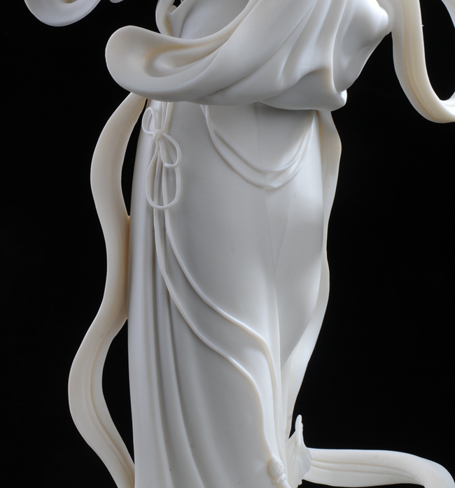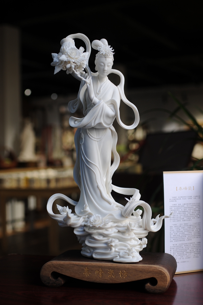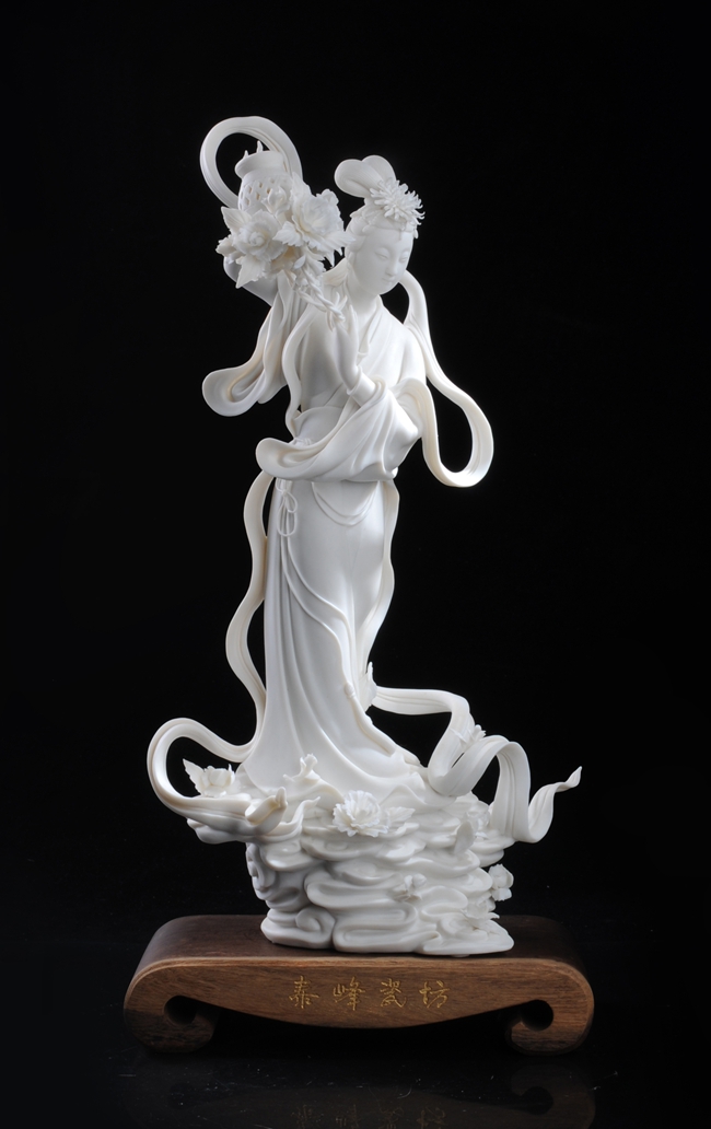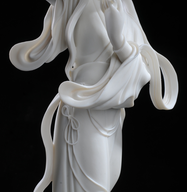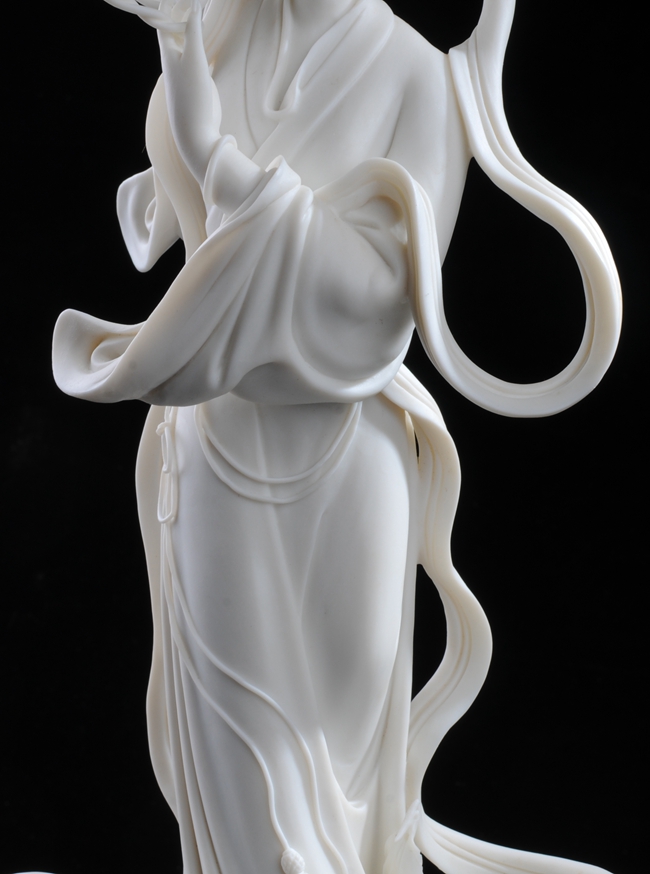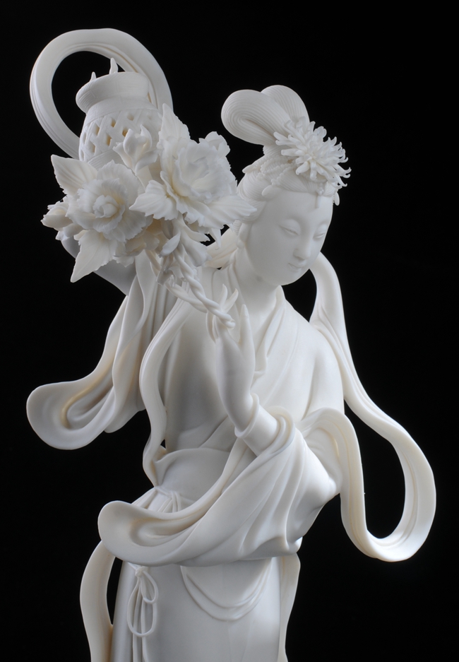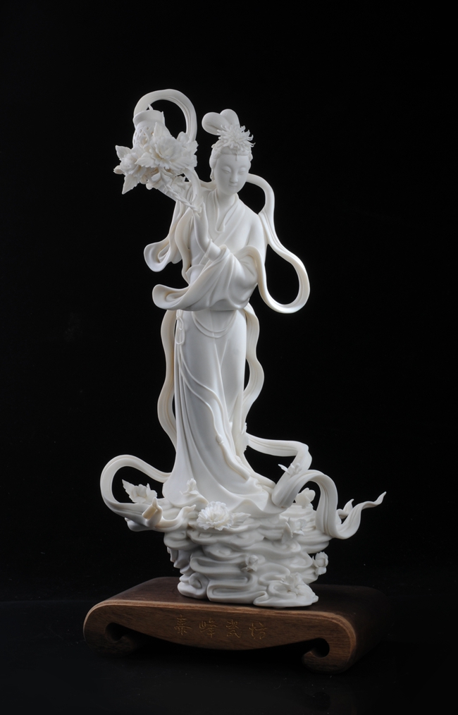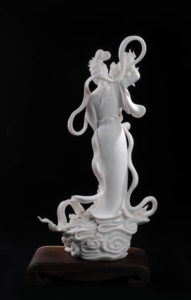 德化是“中国白的故乡”,在世界瓷坛独树一帜,被称为“世界白瓷之母”,德化白瓷温润、明净、典雅、精巧,被称“象牙白”、“鹅绒白”,素有“世界白瓷看中国,中国白瓷看德化”之称。早在明代德化白瓷就名声在外,一代“瓷圣”何朝宗名作流传后世,成为世界各大博物馆收藏的珍品,更对雕塑史上产生深远的影响,形成“何派”雕塑,其开创的捏、塑、雕、刻、刮、削、接、贴八字技法延用至今。何派雕塑注重于细节之美,精益求精,故而十分着意衣纹的刻画,使线条流畅,翻转自然。观其作品仿佛有春风拂面,衣袂飘扬的出尘之感。