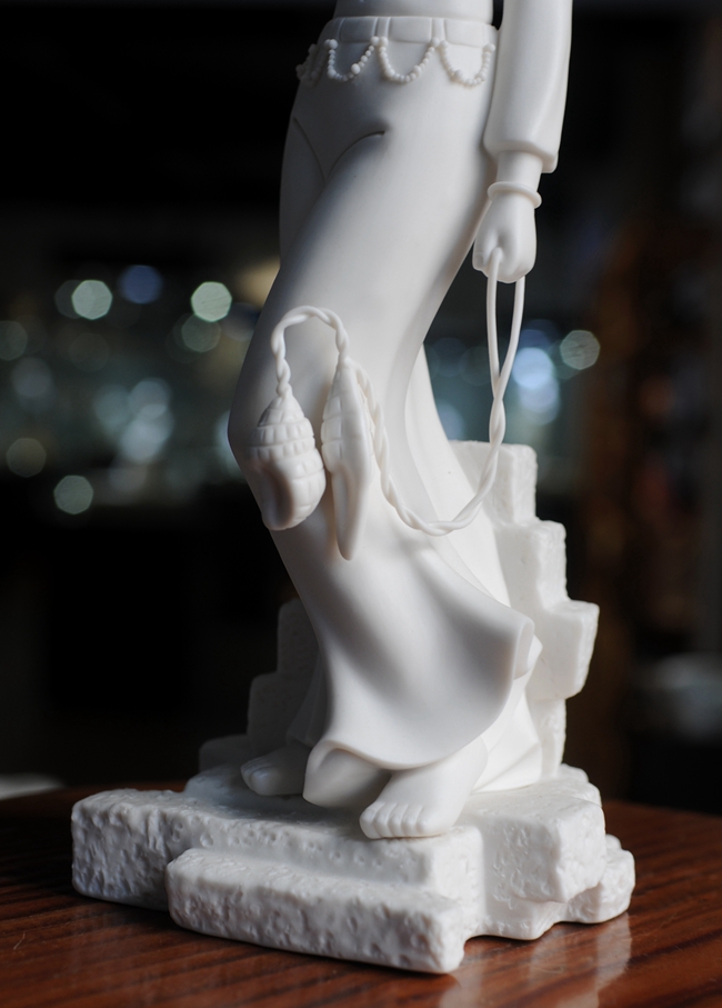 早在明代德化白瓷就名声在外,一代“瓷圣”何朝宗名作流传后世,成为世界各大博物馆收藏的珍品,更对雕塑史上产生深远的影响,形成“何派”雕塑,其开创的捏、塑、雕、刻、刮、削、接、贴八字技法延用至今。何派雕塑注重于细节之美,精益求精,故而十分着意衣纹的刻画,使线条流畅,翻转自然。观其作品仿佛有春风拂面,衣袂飘扬的出尘之感。