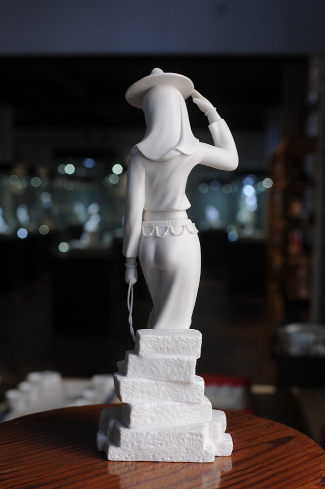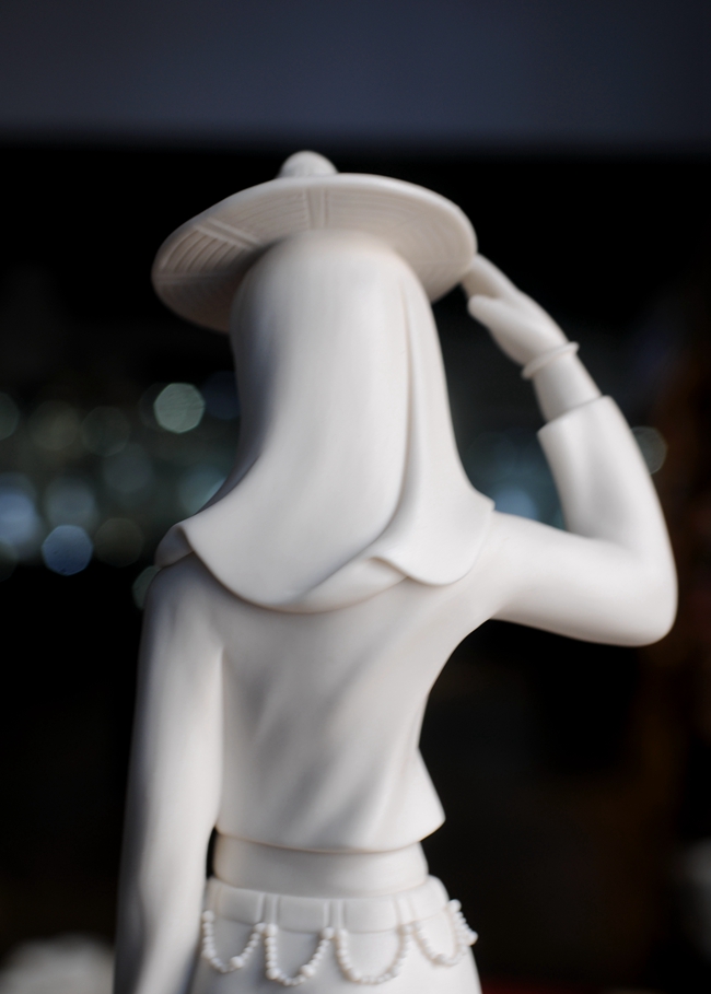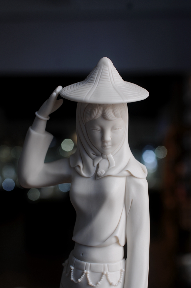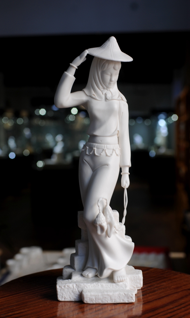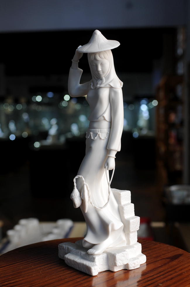 《赶海》由工艺师设计创作。作品以德化温润如玉的德化白瓷为胎质,经1300多度高温烧制,胎体温润如玉,胎体通透,温润如玉,瓷感细腻。作品以写实雕塑手法,见一民间风情女子,头带斗笠,头巾捂住双颊下颌,上身穿短狭斜襟衫,露出肚脐,下穿宽大黑裤,抬脚盘坐石子,独具风采。作品纯手工雕刻,细致刻画,所到之处无不精细赞叹,足见大师在创作时的独运匠心,作品有大师印章落款,兼具审美价值和收藏价值,是一件不可多得的收藏精品。是办公、家居、书房装饰摆设、礼赠、收藏的好选择。