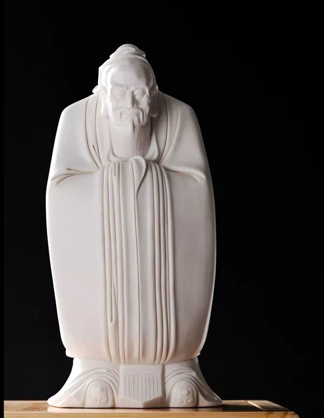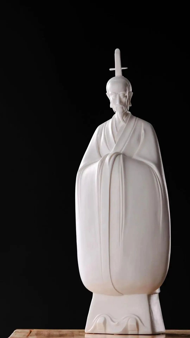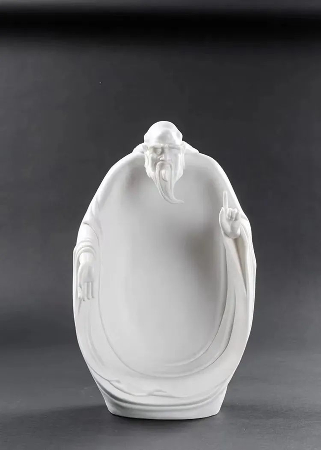 老子便是道家思想的集大成者,在瓷雕传统造像中,通常是通过老子的动作形态、面部表情来展现老子肆意洒脱的道家精髓。而在作品《道法自然》中,陈建阳几乎完全抛弃了传统人物造像习惯,对老子进行大胆的变形,除头部及双手外完全看不出人体特征,整体造型呈瓢状,胸膛向内深陷,仿佛要融于天地之间,又像是要包容世间万物,一手悬于空中伸出食指向上指天,一手掌心朝外手指下垂示意大地,象征着回归真我,不执于物,面部神态恬淡自如,似乎以最平淡、天真的心态面对嚣杂的尘世,传达一种脱尘出俗、仙风道骨、遨游“无为”之境的道家气韵。