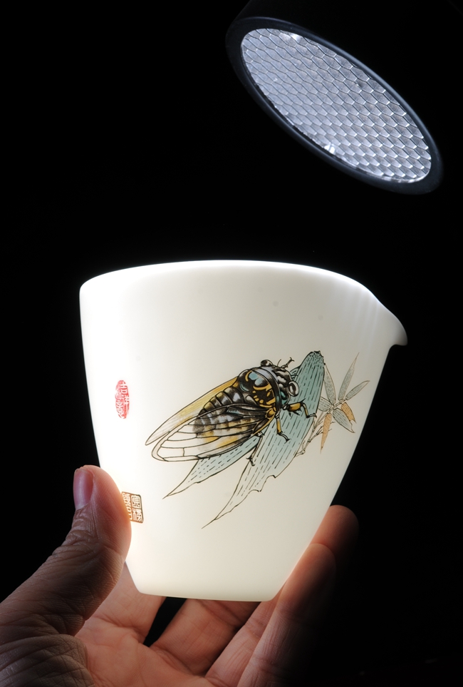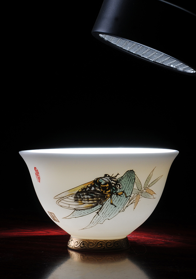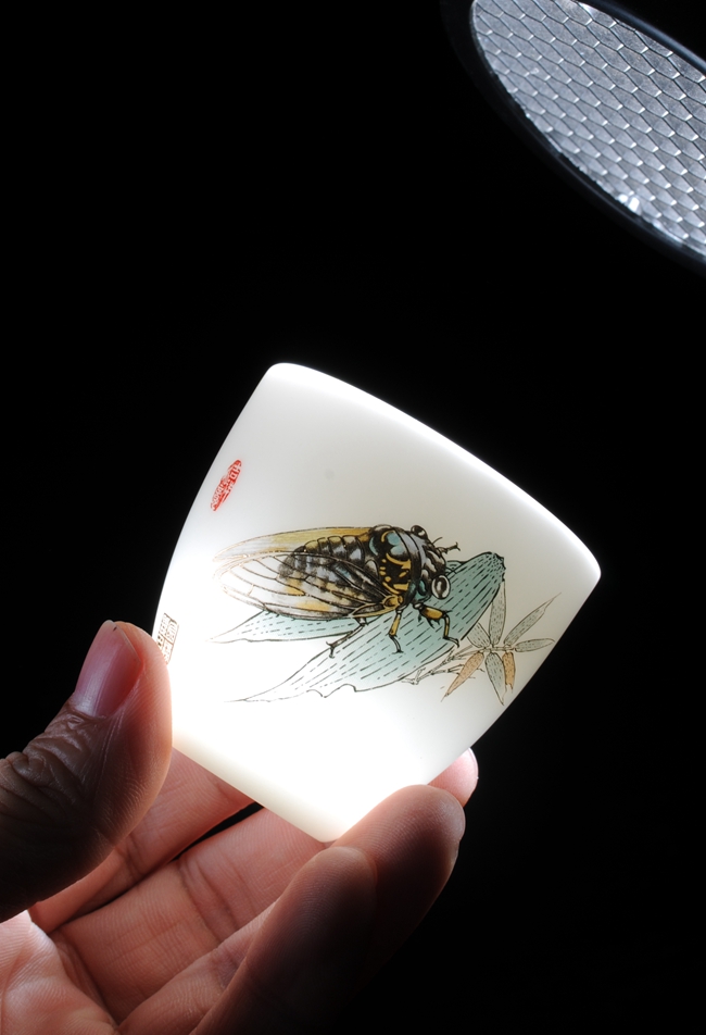 灯光照射下通透自然,釉面莹白如玉,明面如镜,触感温润,宛若凝脂。