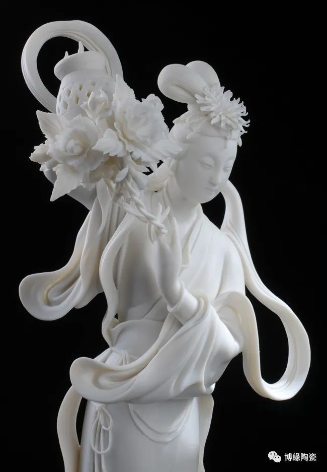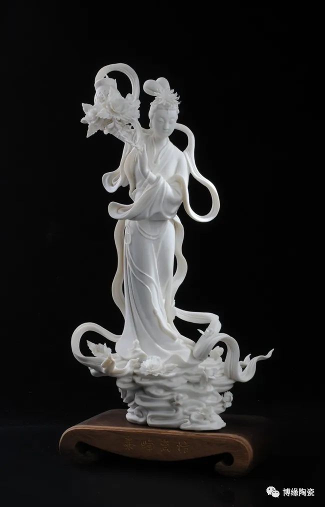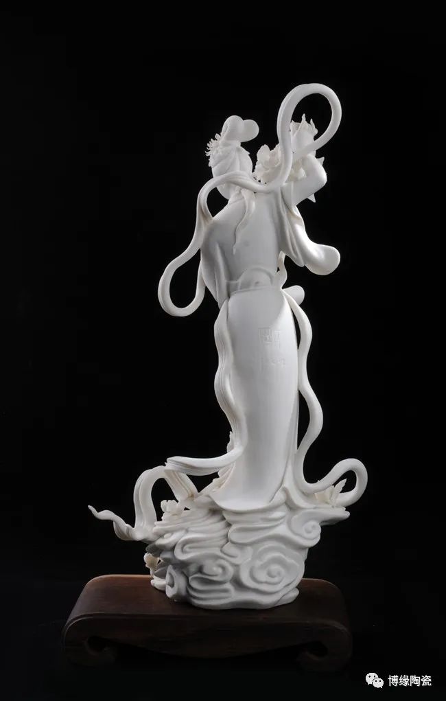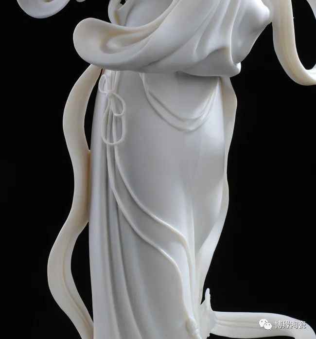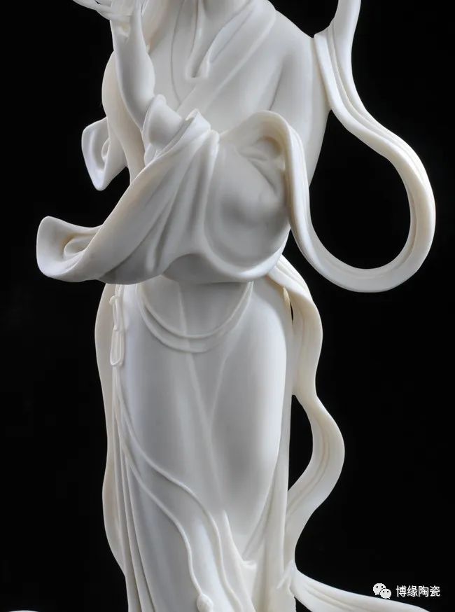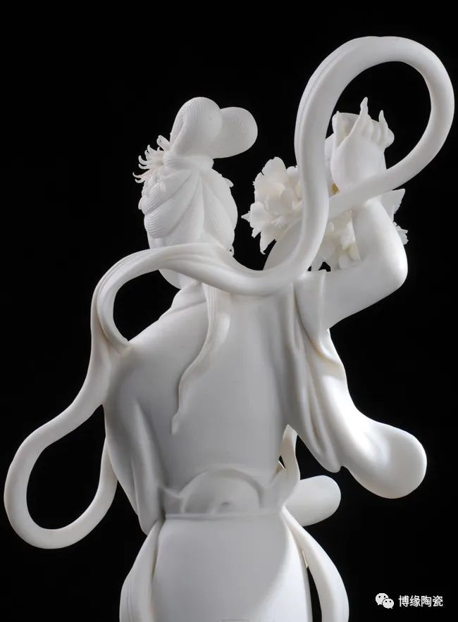 德化是“中国白的故乡”,在世界瓷坛独树一帜,被称为“世界白瓷之母”,德化白瓷温润、明净、典雅、精巧,被称“象牙白”、“鹅绒白”,素有“世界白瓷看中国,中国白瓷看德化”之称。早在明代德化白瓷就名声在外,一代“瓷圣”何朝宗名作流传后世,成为世界各大博物馆收藏的珍品,更对雕塑史上产生深远的影响,形成“何派”雕塑,其开创的捏、塑、雕、刻、刮、削、接、贴八字技法延用至今。何派雕塑注重于细节之美,精益求精,故而十分着意衣纹的刻画,使线条流畅,翻转自然。观其作品仿佛有春风拂面,衣袂飘扬的出尘之感。