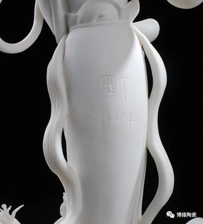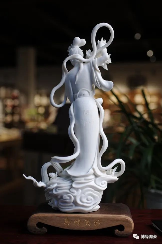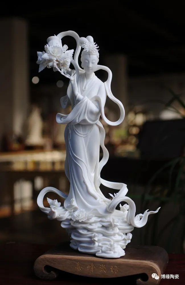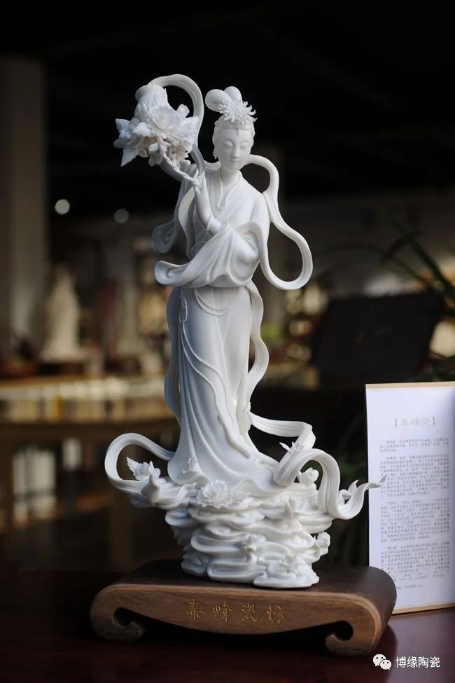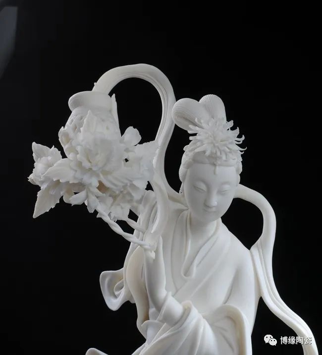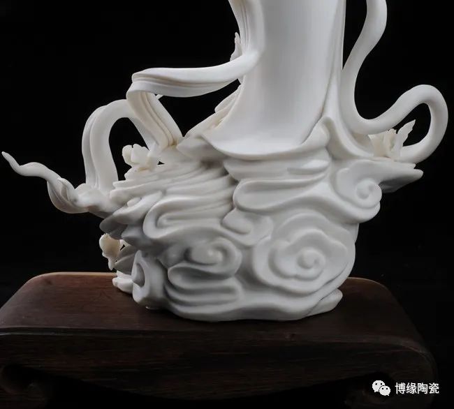 德化是“中国白的故乡”,在世界瓷坛独树一帜,被称为“世界白瓷之母”,德化白瓷温润、明净、典雅、精巧,被称“象牙白”、“鹅绒白”,素有“世界白瓷看中国,中国白瓷看德化”之称。早在明代德化白瓷就名声在外,一代“瓷圣”何朝宗名作流传后世,成为世界各大博物馆收藏的珍品,更对雕塑史上产生深远的影响,形成“何派”雕塑,其开创的捏、塑、雕、刻、刮、削、接、贴八字技法延用至今。何派雕塑注重于细节之美,精益求精,故而十分着意衣纹的刻画,使线条流畅,翻转自然。观其作品仿佛有春风拂面,衣袂飘扬的出尘之感。