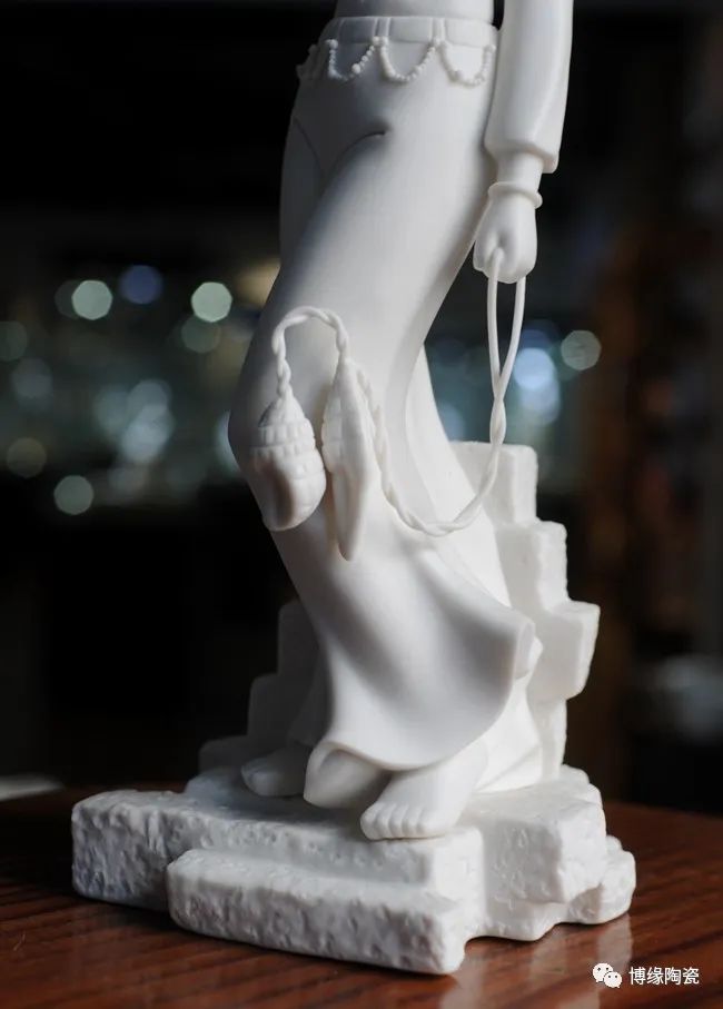 早在明代德化白瓷就名声在外,一代“瓷圣”何朝宗名作流传后世,成为世界各大博物馆收藏的珍品,更对雕塑史上产生深远的影响,形成“何派”雕塑,其开创的捏、塑、雕、刻、刮、削、接、贴八字技法延用至今。何派雕塑注重于细节之美,精益求精,故而十分着意衣纹的刻画,使线条流畅,翻转自然。观其作品仿佛有春风拂面,衣袂飘扬的出尘之感。