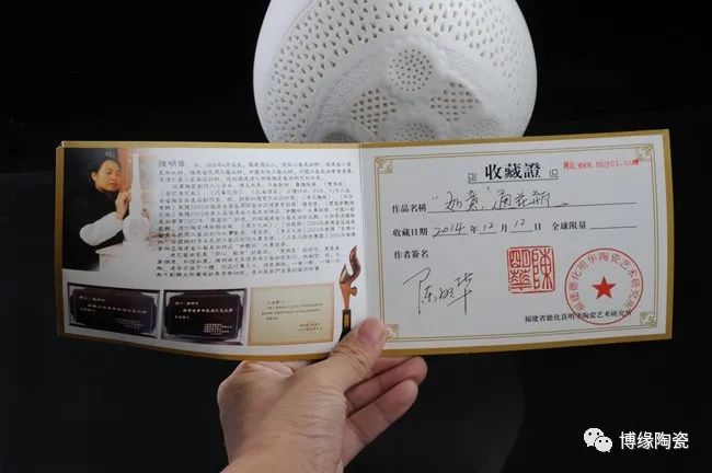 《如意通花》由中国陶瓷艺术大师陈明华设计创作。作品以德化温润如玉的 “中国白”为胎质,经1300多度高温烧制,作品设计巧妙,双耳以如意为造型设计,线条流畅富有动感,制作手法精妙、工序复杂,仿似在瓷中“剪纸”,瓷上“飞花”。整体清秀唯美,创意感足,作品底部落有大师手刻签落款,兼具审美价值和收藏价值,是不可多得的雅作。是办公、家居、书房装饰摆设、礼赠、收藏的好选择。