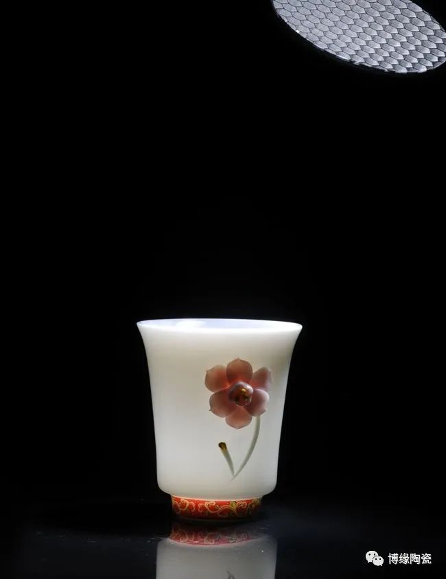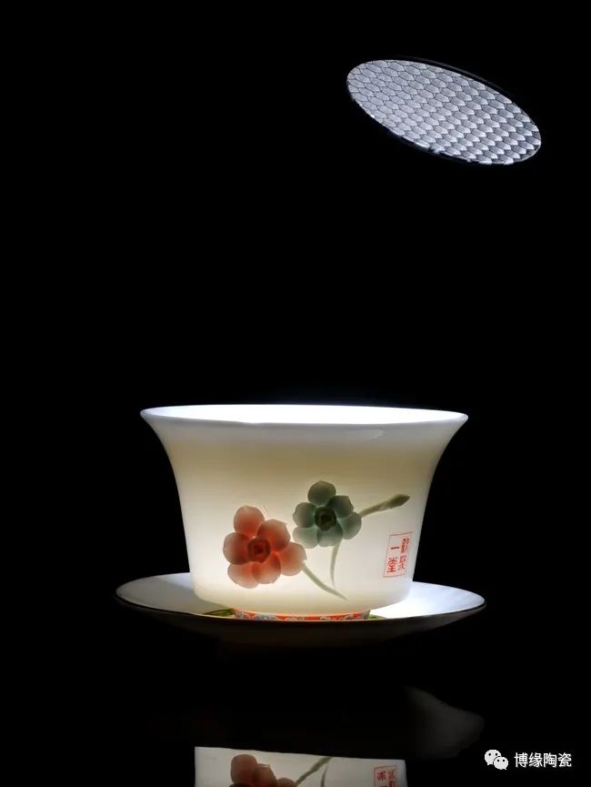 光润明亮,乳白如凝脂透光性好,洁白剔透胎质细密,质地细洁。白瓷细腻纯净,瓷色如光流转,杯身透光,清透玉亮。