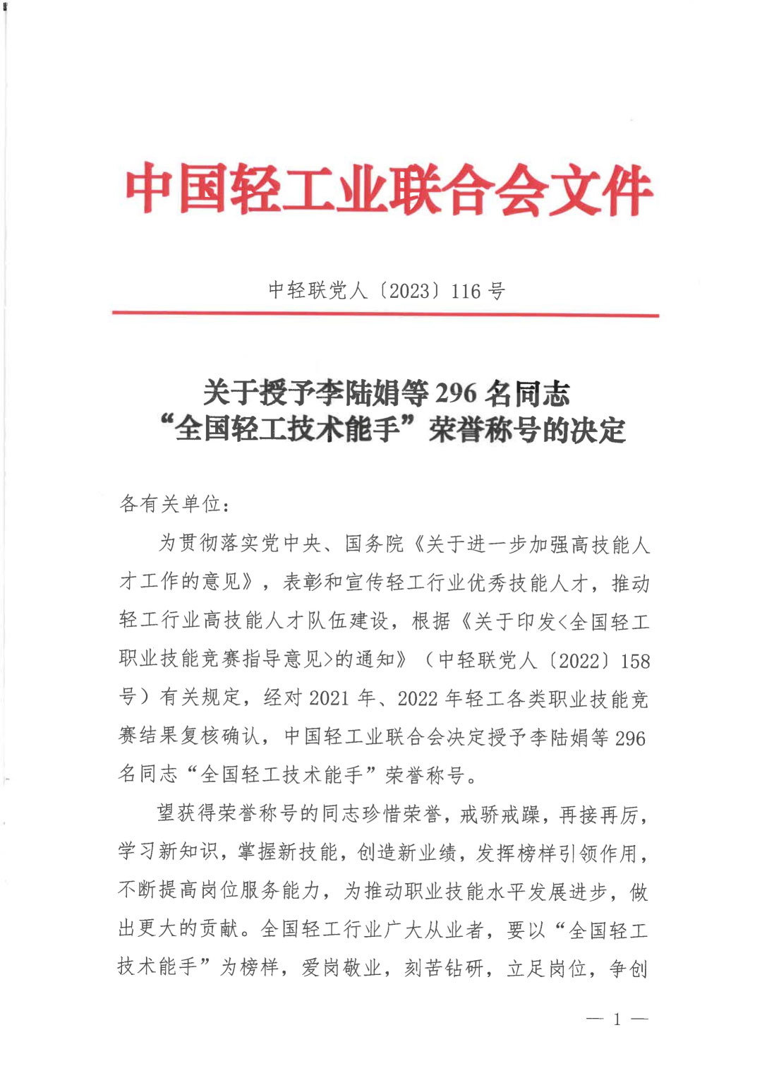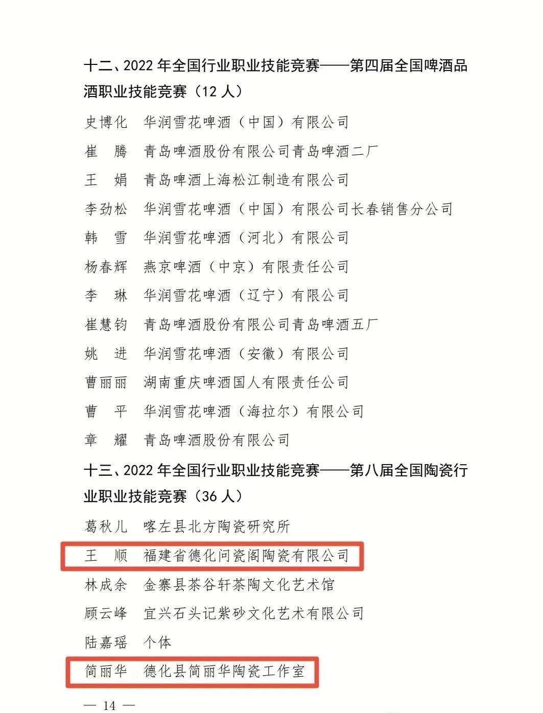 近日,中国轻工业联合会表彰了一批在2022年轻工各类职业技能竞赛活动中取得优异成绩的选手。由福建省陶瓷行业协会选拔入围第八届全国陶瓷行业职业技能竞赛总决赛的王顺、简丽华、苏福良、李小琴、余丽萍荣获“全国轻工技术能手”荣誉称号。