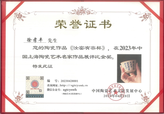 近日,徐孝丰《汝窑有容杯》荣获2023年中国上海陶瓷艺术名家作品展评比金奖。