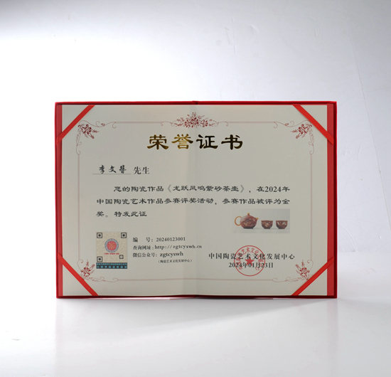 2024年作品《龙跃凤鸣紫砂茶壶》荣获北京中国陶瓷艺术名家作品展金奖