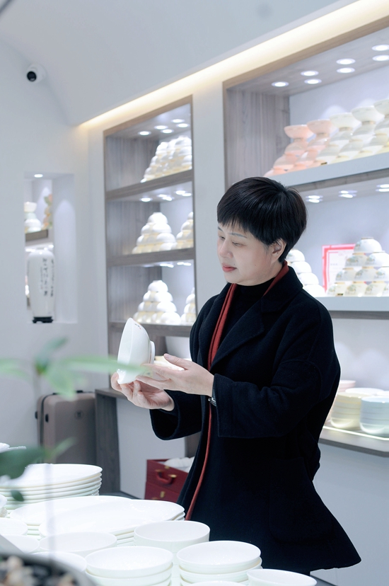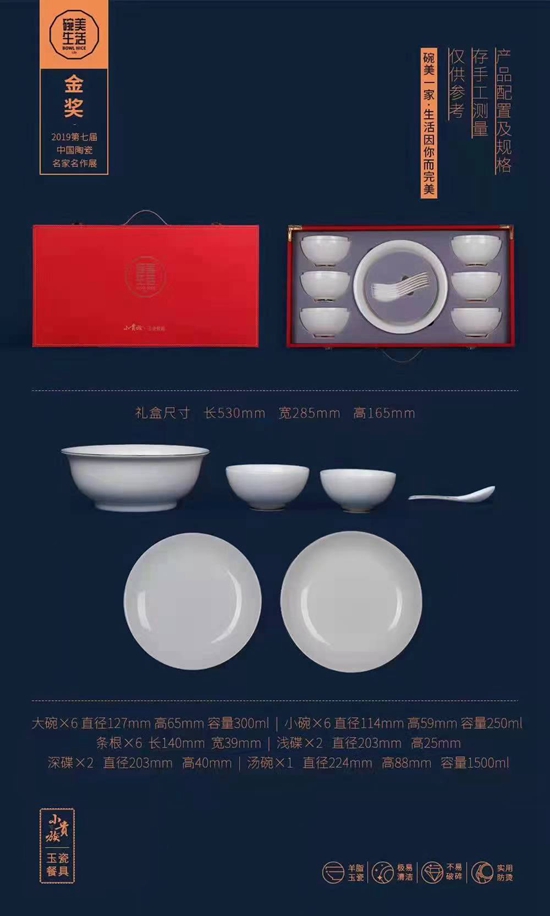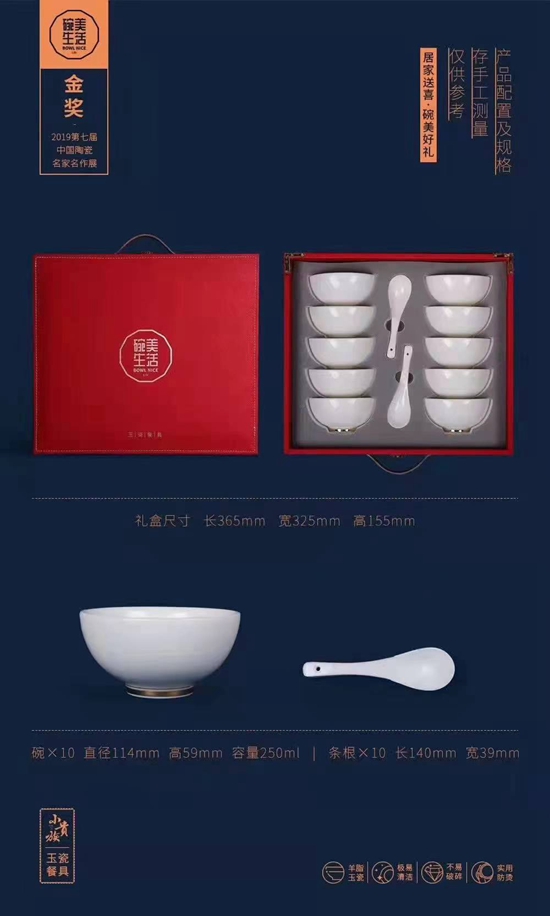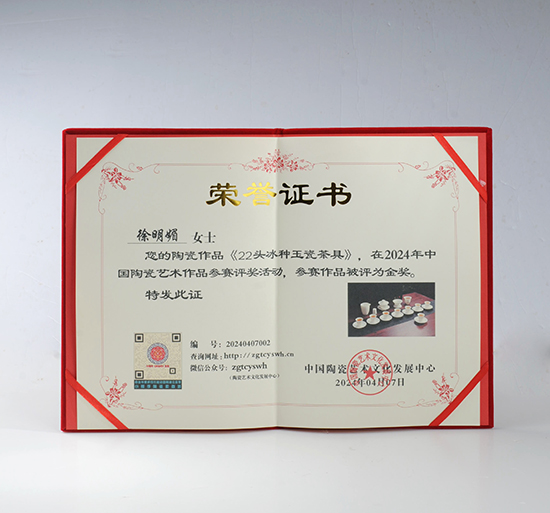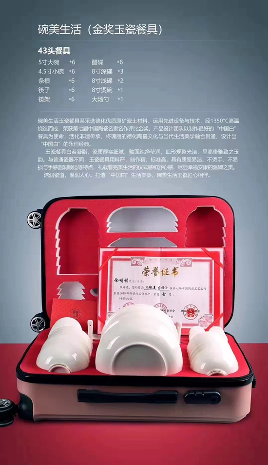 徐明媚经过多年研究,成功开发出一系列羊脂玉瓷、冰种玉瓷餐具、茶具,其是当今高端白瓷上品,精选上好高岭土,每吨原泥料高达30000-50000元,经70多道工序制作,1350多度高温烧制,瓷质温润、似玉,质地白、透,是不可多得的上品。多件作品荣获各大评比金奖,广受经销商、客商、收藏家喜爱。