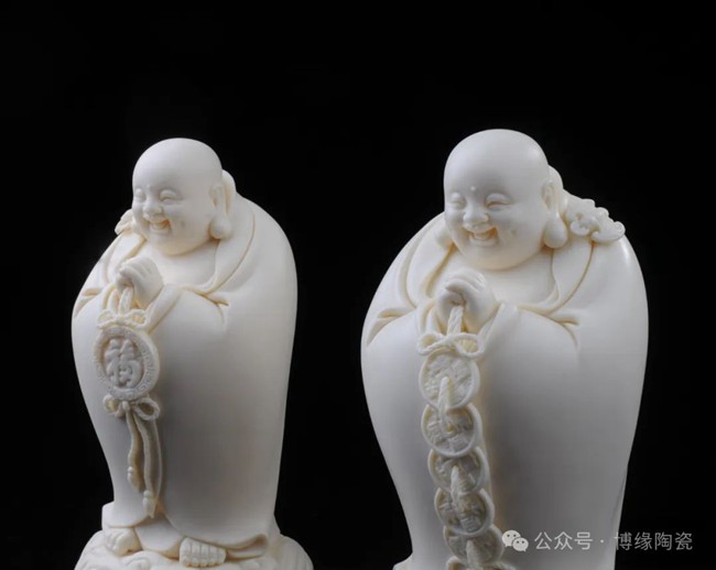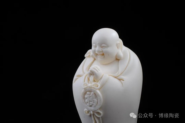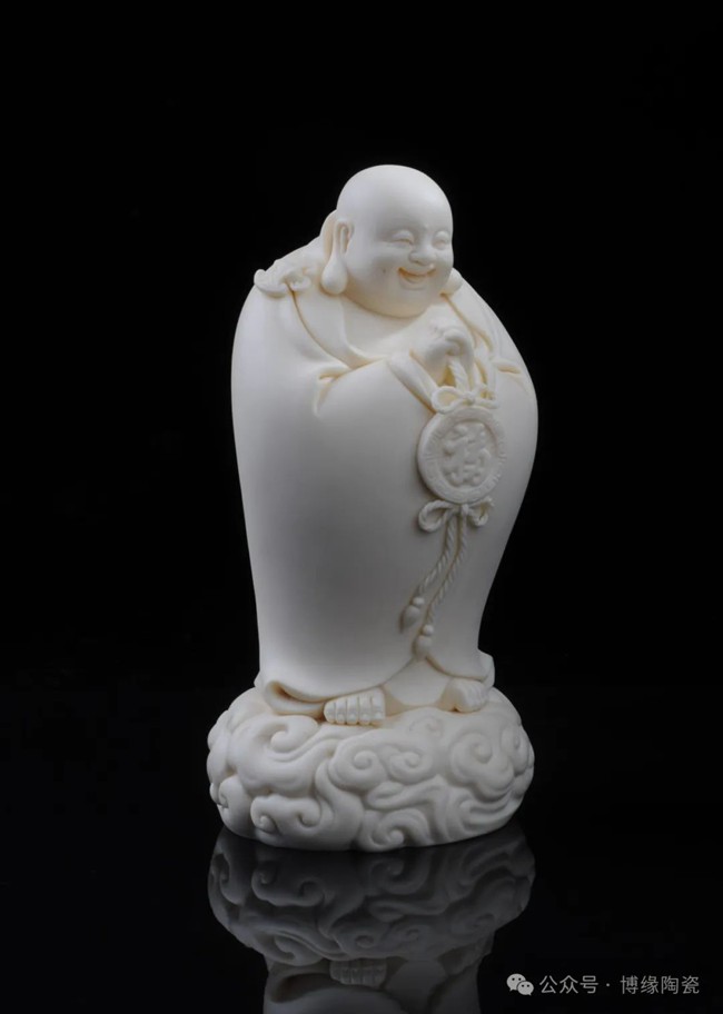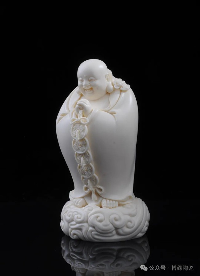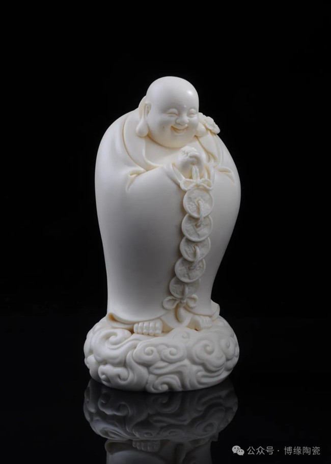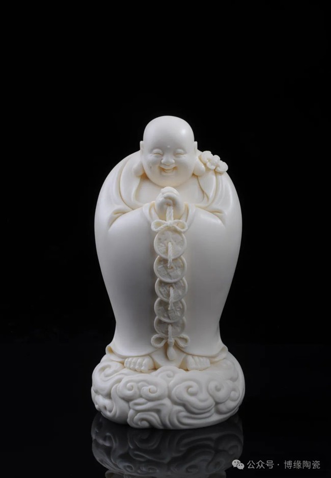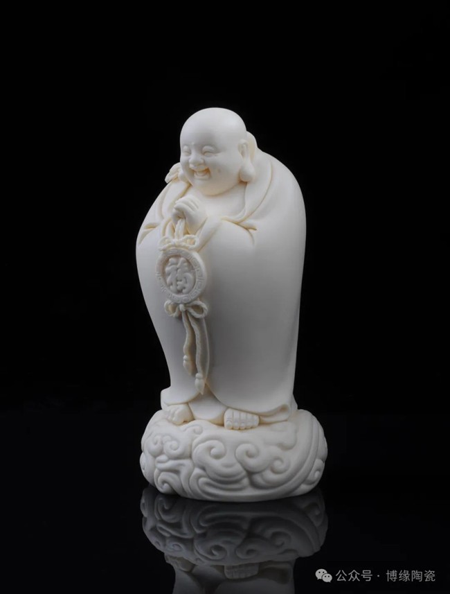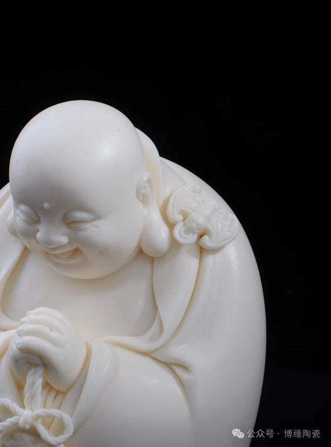 弥勒佛则是德化白瓷佛像里常见题材之一,特别以何朝宗为代表的风格作品,其雕塑注重于细节之美,精益求精,故而十分着意衣纹的刻画,使线条流畅,翻转自然。观其佛像,仿佛有春风拂面,衣袂飘扬的出尘之感。