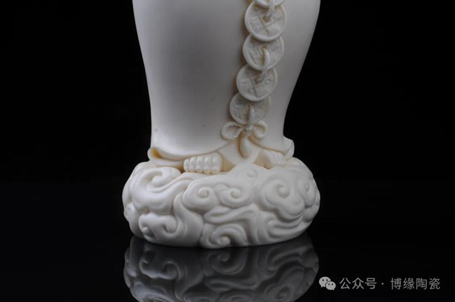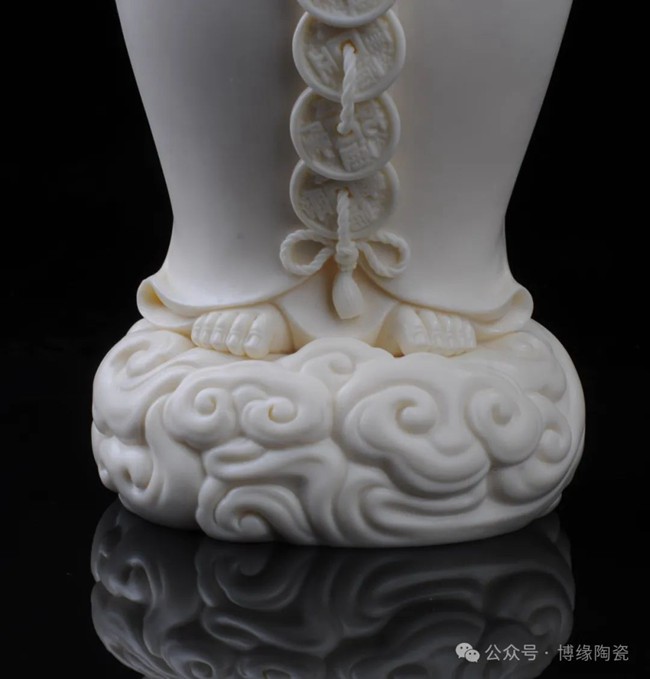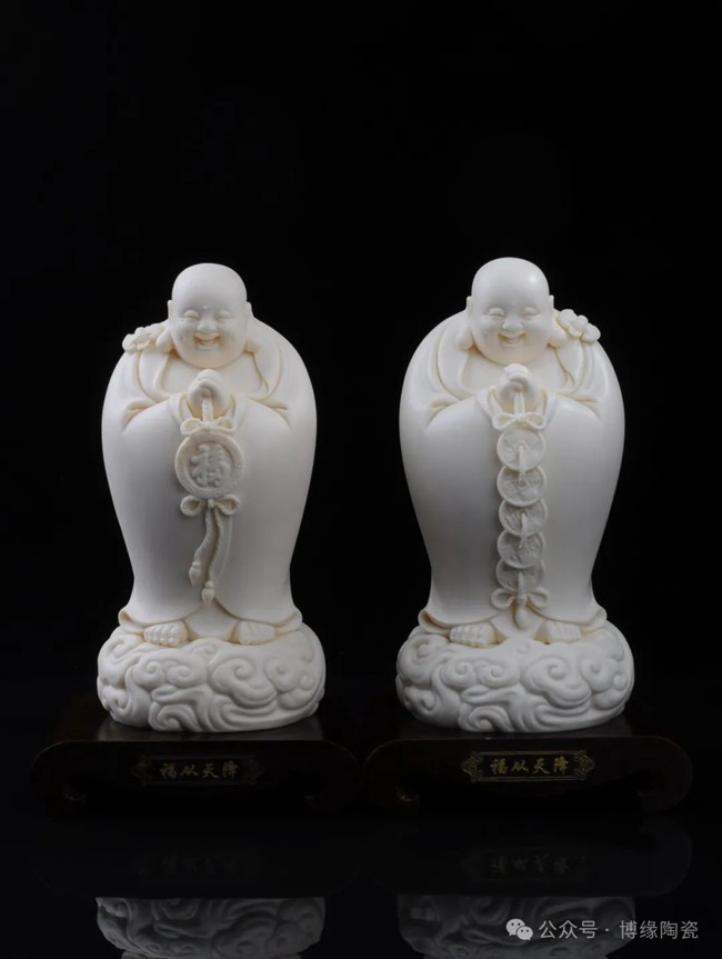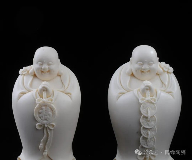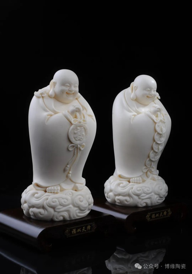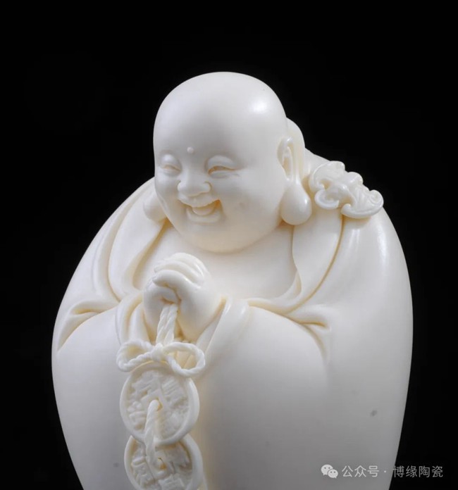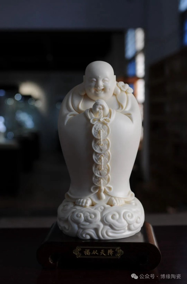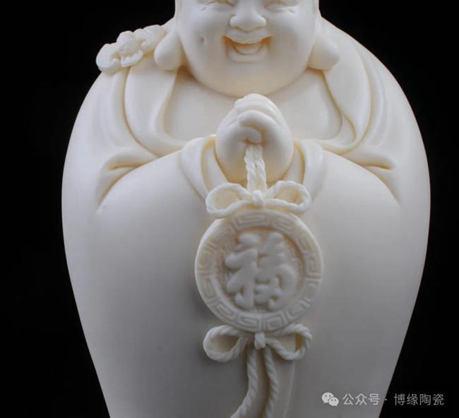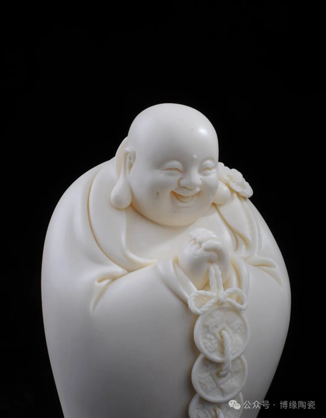 弥勒佛则是德化白瓷佛像里常见题材之一,特别以何朝宗为代表的风格作品,其雕塑注重于细节之美,精益求精,故而十分着意衣纹的刻画,使线条流畅,翻转自然。观其佛像,仿佛有春风拂面,衣袂飘扬的出尘之感。