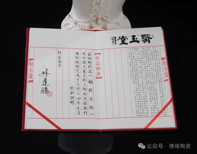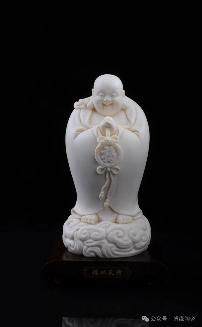 《福从天降》作品由中国工艺美术大师林建胜设计创作,采用德化玉黄瓷为材质,温润如玉;以福文化为底蕴创作。作品雕刻精细,弥勒佛面容饱满,喜笑颜开,酒窝深陷,大耳垂肩,弥勒立于祥云之上,双手相握显现出恭喜之势,手握中国结“福”或“钱币”。作品把弥勒刻画得细腻、生动、传神、喜庆。背面落有林建胜大师个人印章款,是书房、客厅、办公室装饰摆件,也是收藏、礼赠的好选择。