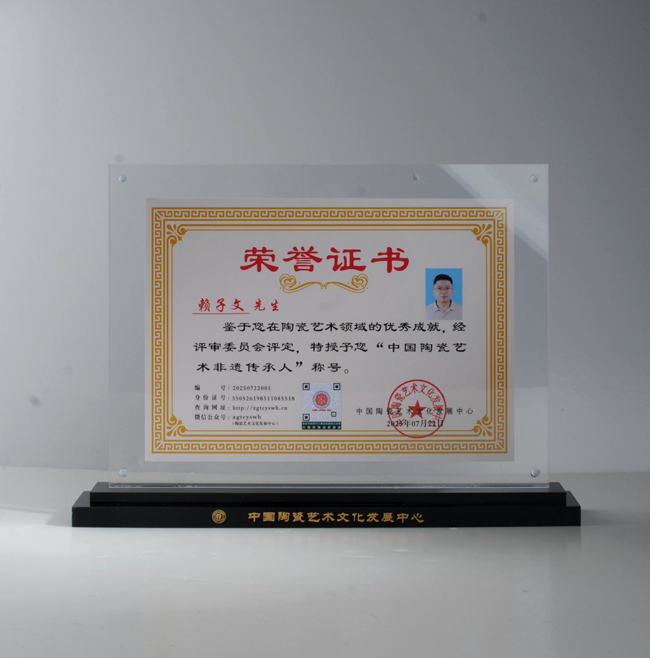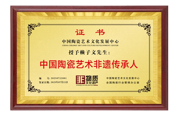 赖子文,中国陶瓷艺术非遗传承人、中国当代工艺美术大师、高级工艺美术大师、福建省工艺美术师、中国陶瓷艺术文化发展中心会员,福建省德化县汇瓷窑陶瓷有限公司艺术总监。