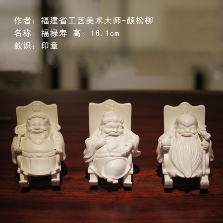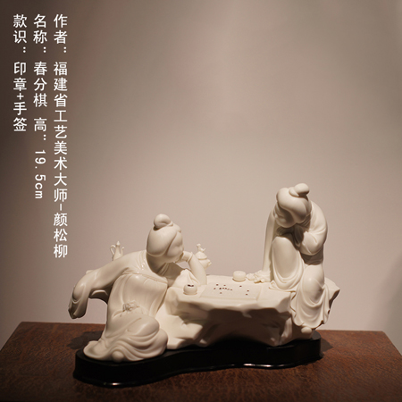 颜松柳,男,1977年8月出生,高级工艺美术师,高级技师,福建省技术能手,福建省工艺美术大师,中国收藏家喜爱的陶瓷艺术大师。现任德化瓷言坊艺术总监,泉州工艺美术学院客座教授,泉州市工艺美术协会理事,福建省工艺美术学会理事,中国陶瓷工业协会陶瓷艺术专业委员理事。1993年学艺于百年老字号“蕴玉瓷庄”,1995年毕业于德化陶瓷职业技术学校,进修于福建工艺美术学校雕塑系、中央工艺美术学院陶瓷系。2005年创立“瓷言坊”,期间为西安大唐芙蓉园设计制作大型组雕《召见使节》、作品《唐韵仕女》被西安市政府选赠首次来访的中国国民党主席连战和亲民党主席宋楚瑜(合作);为德化陶瓷博物馆设计制作大型陶瓷浮雕壁画《瓷国史话》(合作);2006年荣获“中国收藏家喜爱的陶瓷艺术大师”称号, 作品多次获得“百花奖” 、“金凤凰”、“争艳杯”等专业艺术设计大赛金奖。作品《春风得意马蹄疾》收藏于“中国工艺美术馆”、“英国珍宝博物馆”;《一苇渡江》收藏于“英国珍宝博物馆”、“福建博物院”;《观沧海》收藏于“福建工艺美术珍品馆”。