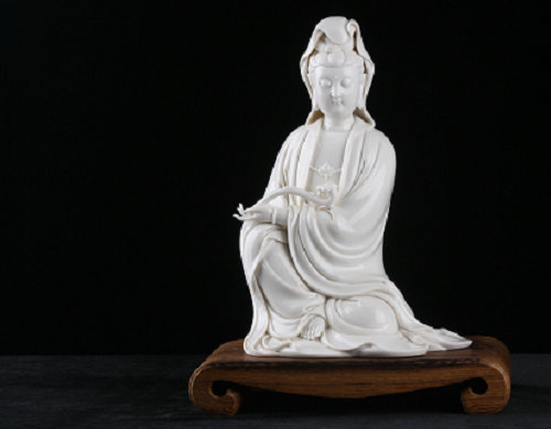 此尊观音像高47厘米,底长24厘米,宽16厘米,头髻发束,面容慈祥,宽袖衣裙、手提竹篮、脚踏鳌背,釉面光润明亮,胎质致密透光,雕塑精细,采用堆花、贴花、镂空、刻画等多种工艺,使观音衣褶裙带线条流畅、洗练,形象栩栩如生。