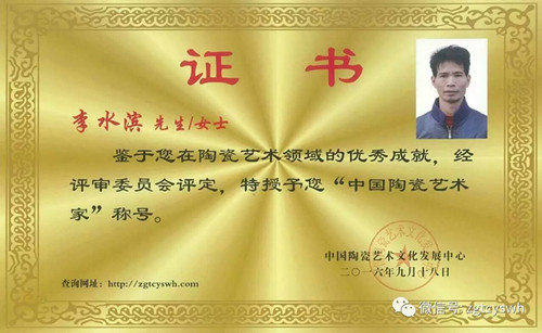 2016年经中国陶瓷艺术文化发展中心评审委员会评定为“中国陶瓷艺术家”。