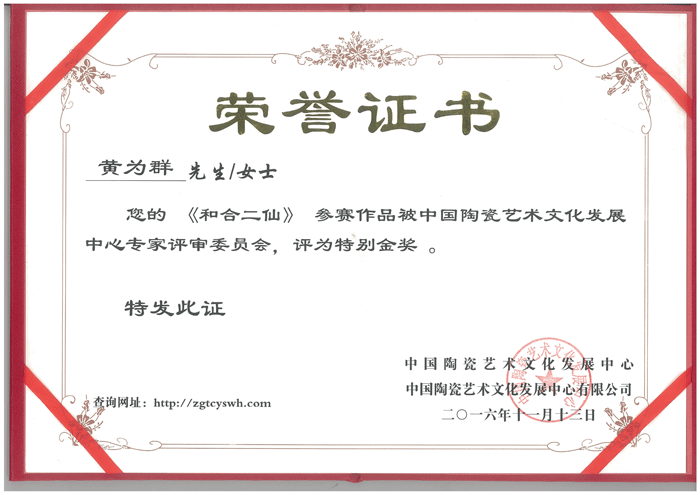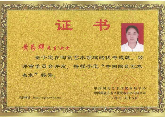 2016年经中国陶瓷艺术文化发展中心评审委员会评定为“中国陶瓷艺术名家”。