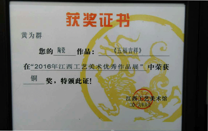 创作的《五福吉祥》在2016年江西工艺美术优秀作品展中荣获“铜奖”。并被江西工艺美术馆收藏。 作品《釉上粉彩童子》经中国陶瓷艺术文化发展中心评审委员会评定为“特别金奖”。