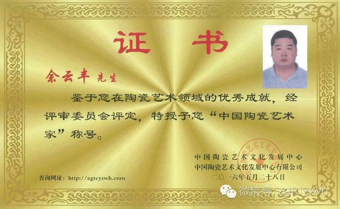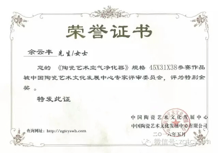 这一系列产品已获得国家知识产权局专利认证(专利号:ZL201530276083.2)(ZL201530275828.3)2016年经中国陶瓷艺术文化发展中心评审委员会评定为“中国陶瓷艺术家”。