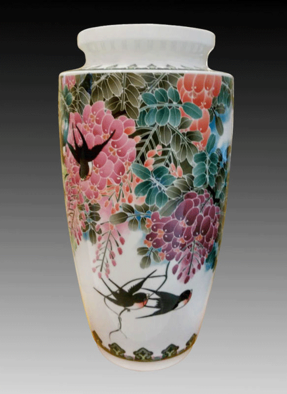 个人简介: 肖燕辉,女,湖南醴陵人,1975年生。大专本科学历,湖南省陶瓷工艺大师,醴陵美术协会会员,中国陶瓷工业协会会员。1994年进入群力瓷厂(红官窑)工作,后拜齐白石画馆馆长,国家高级工艺美术大师汤清海先生为师,学习山水,花鸟,人物走兽。擅长山水,花鸟。