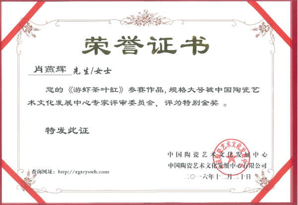 2016年作品《大号茶叶缸》经中国陶瓷艺术文化发展中心评审委员会评定为“特别金奖”。