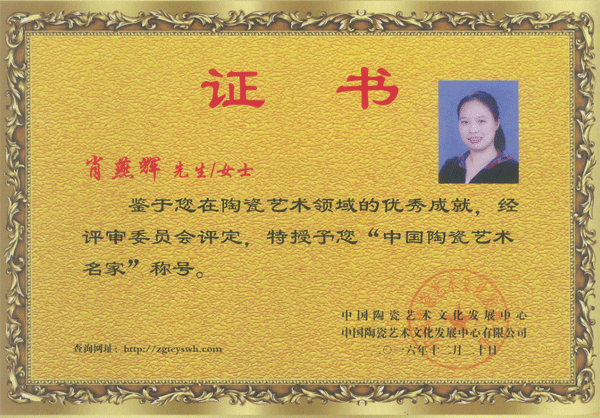 2016年被中国陶瓷艺术文化发展中心评审委员会授予“中国陶瓷艺术名家”荣誉称号。