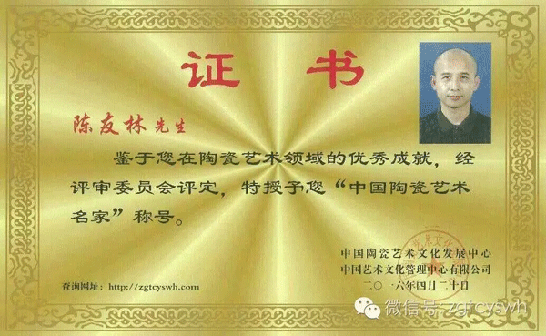 2016年经中国陶瓷艺术文化发展中心评审委员会评定为”中国陶瓷艺术名家“称号。 |