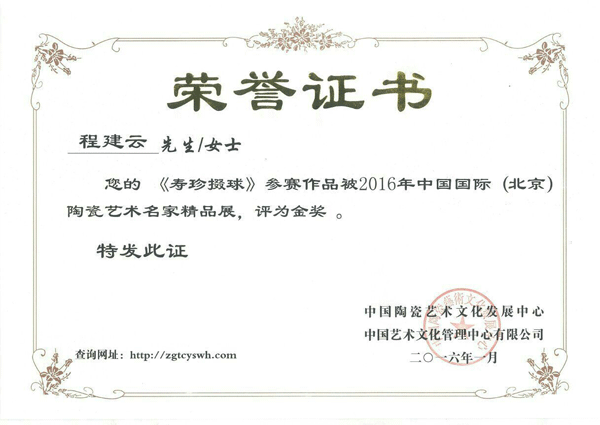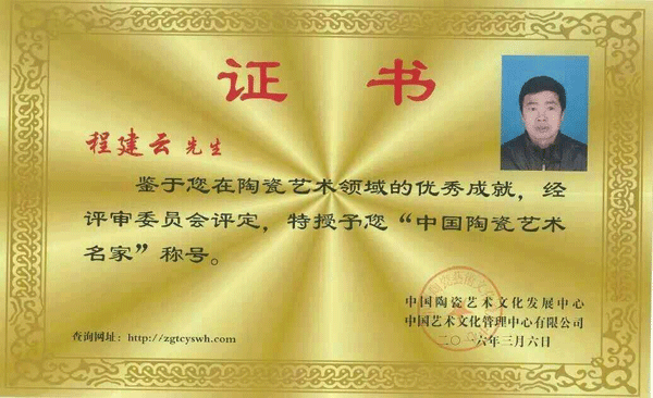 2016年经中国陶瓷艺术文化发展中心评审委员会评定为“中国陶瓷艺术名家”