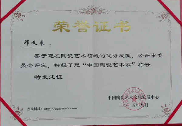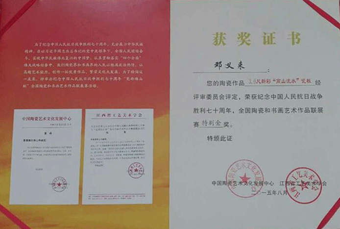 几十年来的陶瓷艺术绘画让邓义来的获得的不仅是陶瓷艺术技法上的娴熟,更是让他获得不少奖项。