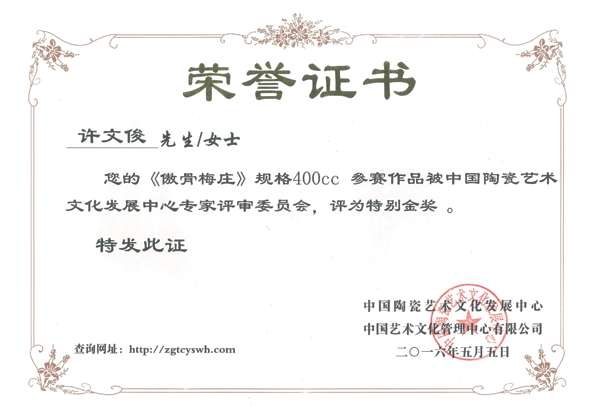 2015年作品《傲骨梅桩》荣获美国巴拿马万国博览会百年庆典中国颁奖盛典“最具收藏价值奖”2016年作品《供春壶》经中国陶瓷艺术文化发展中心评审委员会评定为“特别金奖”