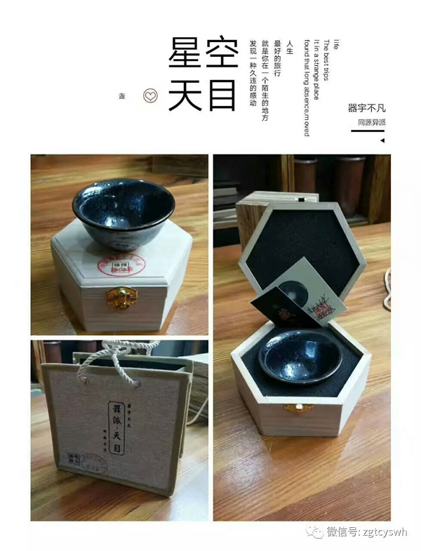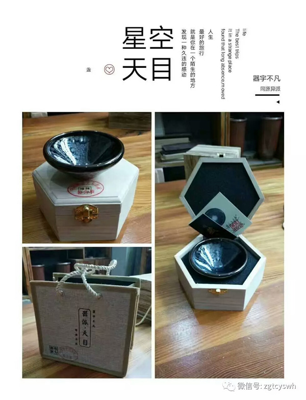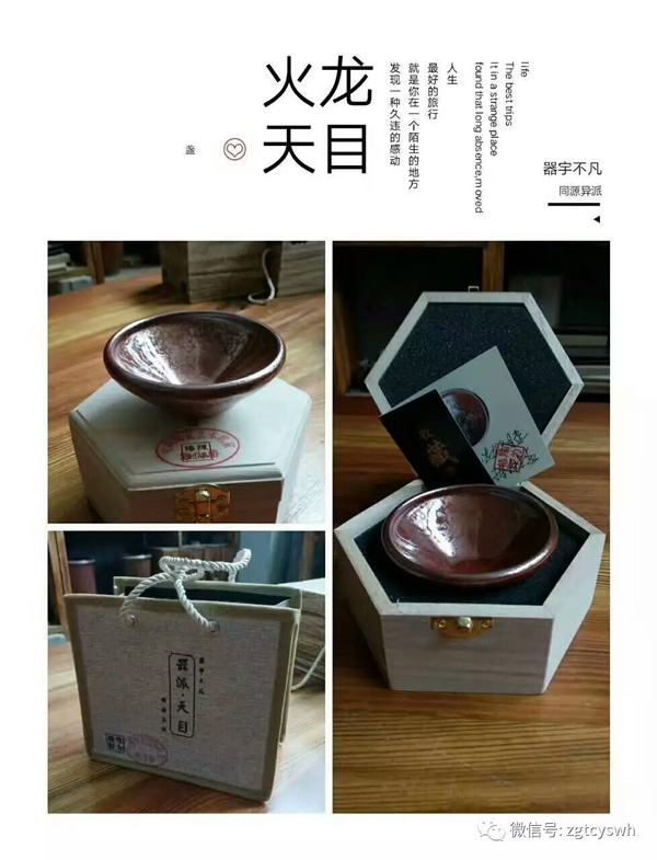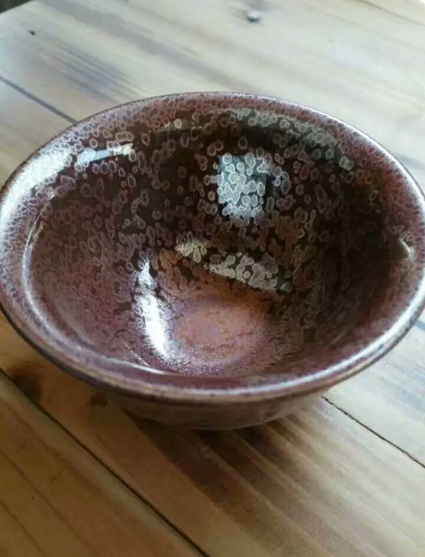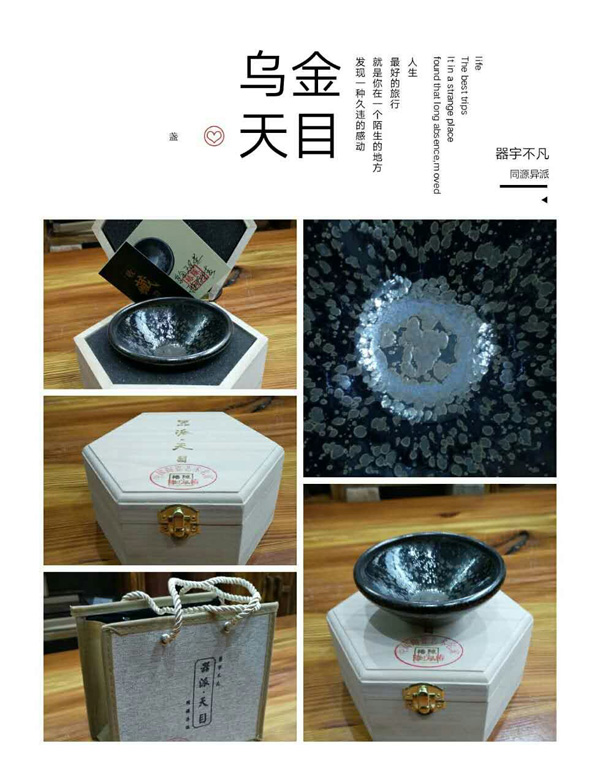 天目釉通常于氧化铁成分较高的陶瓷釉料,传统制作工艺研成,1310度以上高温烧制过程,火候不同的温段情况下,氧化铁与其矿合物相融互体产生变化,釉面结晶多彩斑纹,通称“天目”釉。国际陶瓷界通称“temmokn""。历代以来陶瓷釉史载中‘天目釉’是既名贵又有收藏价值的上乘鉴赏之釉称号。