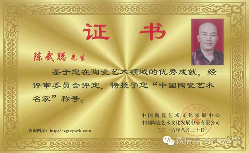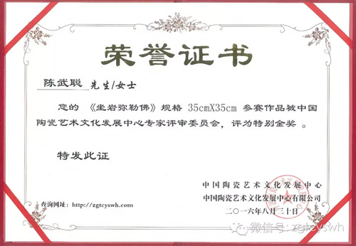 2016年8月30日参赛作品《坐岩弥勒佛》被中国陶瓷艺术文化发展中心评为"特别金奖"